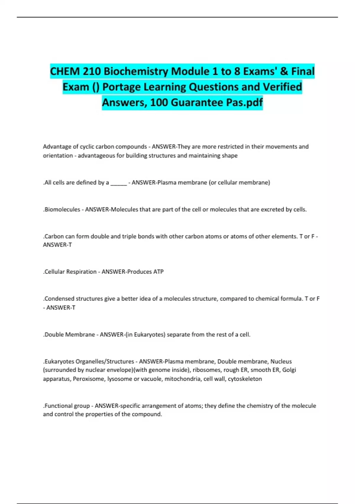 CHEM 210 Biochemistry Module 1 to 8 Exams' & Final Exam () Portage Learning Questions and Verified Answers, 100 Guarantee Pas Advantage of cyclic carbon compounds - ANSWER-They are more restricted in their movements and orientation - advantageous for building structures and maintaining shape .All cells are defined by a _____ - ANSWER-Plasma membrane (or cellular membrane) .Biomolecules - ANSWER-Molecules that are part of the cell or molecules that are excreted by cells. .Carbon can form double and triple bonds with other carbon atoms or atoms of other elements. T or F - ANSWER-T .Cellular Respiration - ANSWER-Produces ATP .Condensed structures give a better idea of a molecules structure, compared to chemical formula. T or F - ANSWER-T .Double Membrane - ANSWER-(in Eukaryotes) separate from the rest of a cell. .Eukaryotes Organelles/Structures - ANSWER-Plasma membrane, Double membrane, Nucleus (surrounded by nuclear envelope)(with genome inside), ribosomes, rough ER, smooth ER, Golgi apparatus, Peroxisome, lysosome or vacuole, mitochondria, cell wall, cytoskeleton .Functional group - ANSWER-specific arrangement of atoms; they define the chemistry of the molecule and control the properties of the compound. .Golgi apparatus - ANSWER-(Eukaryotes) Receives the products from the rough ER on their way to a final destination; organizes .How many bonds can a Carbon form? - ANSWER-4! Due to having 4 valence electrons .Larger molecules develop more complex structures. T or F - ANSWER-T .Line-bond Drawing - ANSWER-Most efficient method to show structure, but requires the most interpretation. .Macromolecules - ANSWER-large biomolecules