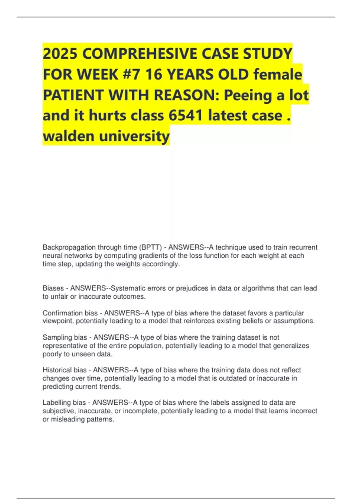 2025 COMPREHESIVE CASE STUDY FOR WEEK #7 16 YEARS OLD female PATIENT WITH REASON: Peeing a lot and it hurts class 6541 latest case . walden university Backpropagation through time (BPTT) - ANSWERS--A technique used to train recurrent neural networks by computing gradients of the loss function for each weight at each time step, updating the weights accordingly. Biases - ANSWERS--Systematic errors or prejudices in data or algorithms that can lead to unfair or inaccurate outcomes. Confirmation bias - ANSWERS--A type of bias where the dataset favors a particular viewpoint, potentially leading to a model that reinforces existing beliefs or assumptions. Sampling bias - ANSWERS--A type of bias where the training dataset is not representative of the entire population, potentially leading to a model that generalizes poorly to unseen data.