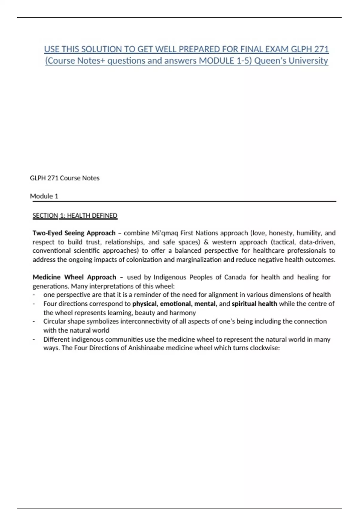 USE THIS SOLUTION TO GET WELL PREPARED FOR FINAL EXAM GLPH 271 (Course Notes+ questions and answers MODULE 1-5) Queen's University GLPH 271 Course Notes Module 1 SECTION 1: HEALTH DEFINED Two-Eyed Seeing Approach – combine Mi’qmaq First Nations approach (love, honesty, humility, and respect to build trust, relationships, and safe spaces) & western approach (tactical, data-driven, conventional scientific approaches) to offer a balanced perspective for healthcare professionals to address the ongoing impacts of colonization and marginalization and reduce negative health outcomes. Medicine Wheel Approach – used by Indigenous Peoples of Canada for health and healing for generations. Many interpretations of this wheel: - one perspective are that it is a reminder of the need for alignment in various dimensions of health - Four directions correspond to physical, emotional, mental, and spiritual health while the centre of the wheel represents learning, beauty and harmony - Circular shape symbolizes interconnectivity of all aspects of one’s being including the connection with the natural world - Different indigenous communities use the medicine wheel to represent the natural world in many ways. The Four Directions of Anishinaabe medicine wheel which turns clockwise: