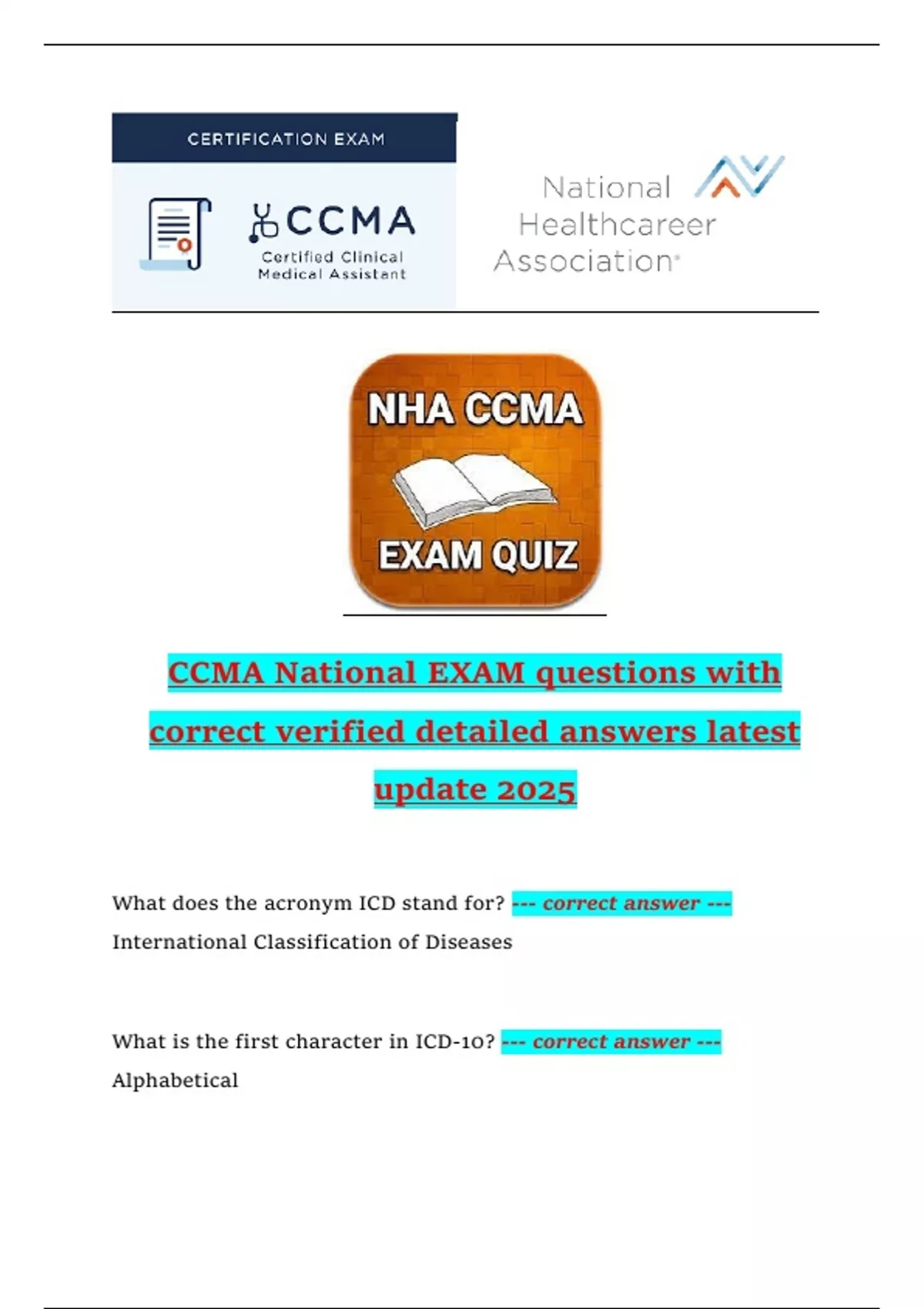 CCMA National EXAM questions with correct verified detailed answers latest update 2025 What does the acronym ICD stand for? --- correct answer ---International Classification of Diseases What is the first character in ICD-10? --- correct answer ---Alphabetical What is the second and third character in ICD-10? --- correct answer ---Numeric How many characters are there in ICD-10? --- correct answer ---Seven What are the fourth, fifth, six, or seventh characters in ICD 10? --- correct answer ---either alphabetical or numeric
