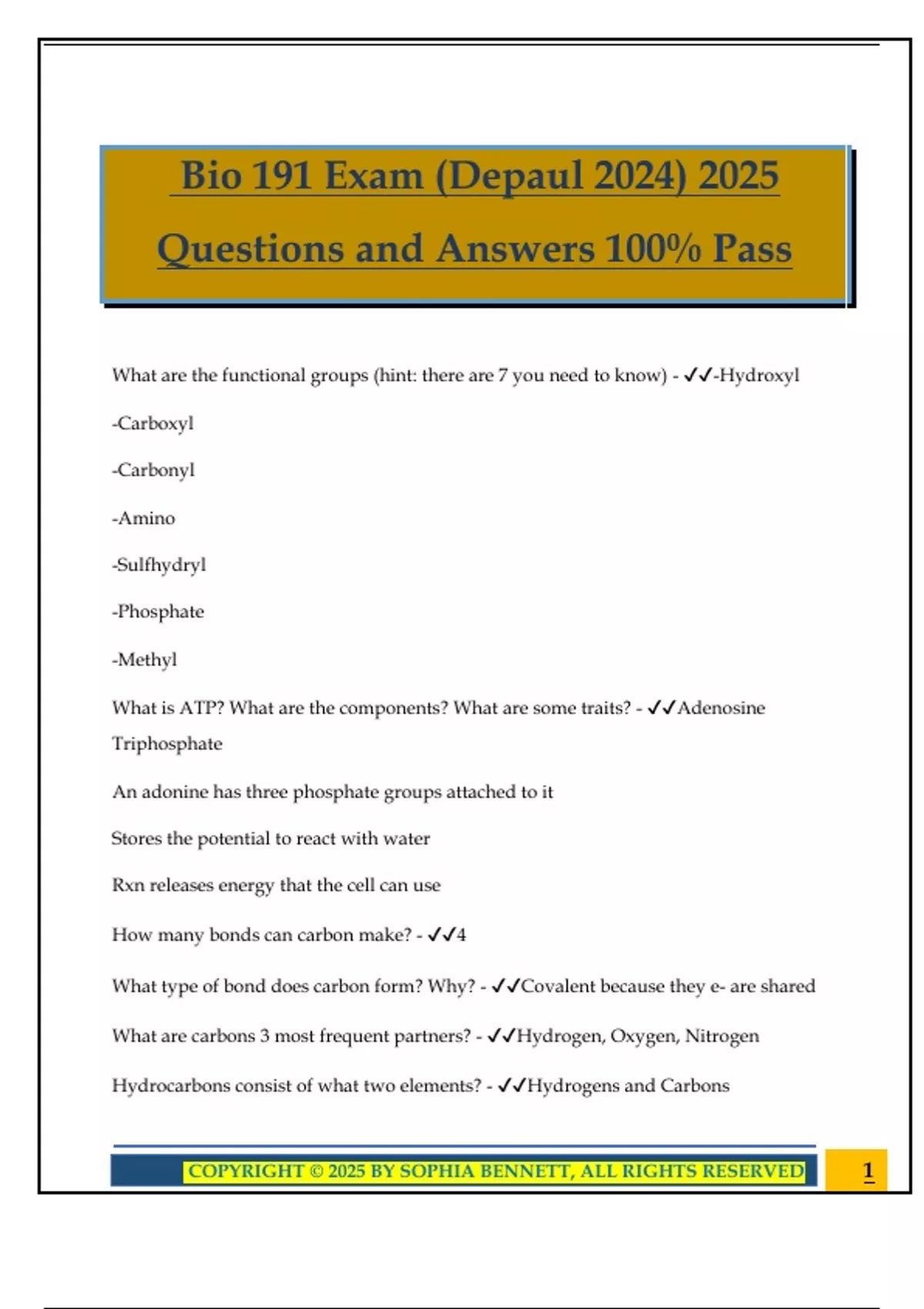 Bio 191 Exam (Depaul 2024) 2025 Questions and Answers 100% Pass What are the functional groups (hint: there are 7 you need to know) - -Hydroxyl -Carboxyl -Carbonyl -Amino -Sulfhydryl -Phosphate -Methyl What is ATP? What are the components? What are some traits? - Adenosine Triphosphate An adonine has three phosphate groups attached to it Stores the potential to react with water Rxn releases energy that the cell can use How many bonds can carbon make? - 4 What type of bond does carbon form? Why? - Covalent because they e- are shared What are carbons 3 most frequent partners? - Hydrogen, Oxygen, Nitrogen Hydrocarbons consist of what two elements? - Hydrogens and Carbons 2COPYRIGHT © 2025 BY SOPHIA BENNETT, ALL RIGHTS RESERVED True or False: many organic molecules have hydrocarbon components. - True True or False: hydrocarbons undergo reactions that release a large amount of energy. - True _______ are compounds with the same molecular formula but different structures and properties. - Isomers ____________________ have different covalent arrangements of their atoms. - Structural Isomer _______________________ have the same covalent bonds but differ in spatial arrangements. - Cis-Trans Isomer __________________ are isomers that are mirror images of each other. - Enantiomers saturated chains are - all possible bonds with H (no double) unsaturated chains are - not all carbon chains are bonded with hydrogen (double bonds) What are the 4 main biological molecules? - Carbohydrates, Lipids, Proteins, Nucleic Acids True or false: Monomers are the smaller units that then come together to make a polymer - True What is hydrolysis? Explain how it is different from dehydration synthesis. (hint: use the word lyse) - Hydrolysis is the breakdown o