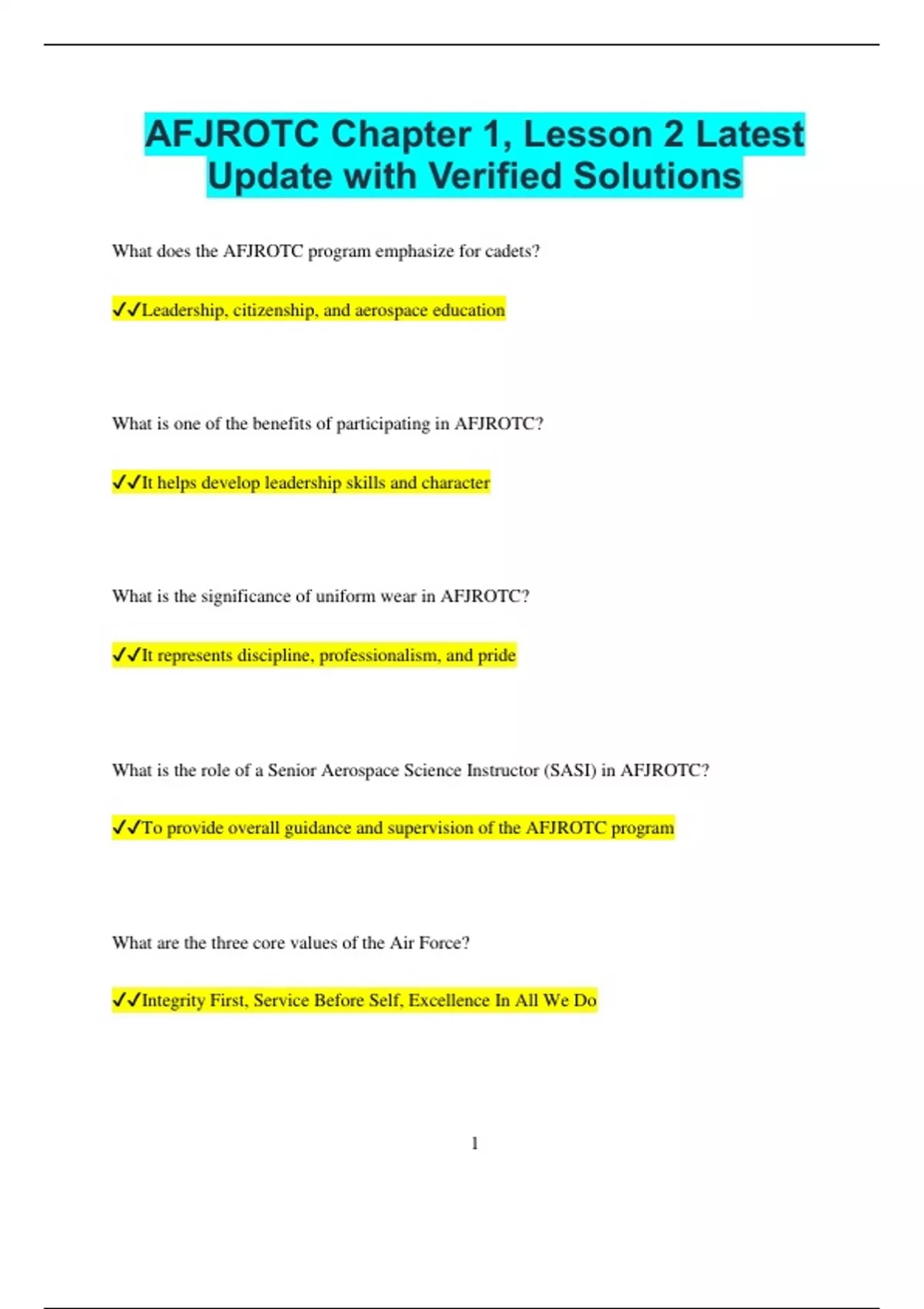 AFJROTC Chapter 1, Lesson 2 Latest Update with Verified Solutions What does the AFJROTC program emphasize for cadets? Leadership, citizenship, and aerospace education What is one of the benefits of participating in AFJROTC? It helps develop leadership skills and character What is the significance of uniform wear in AFJROTC? It represents discipline, professionalism, and pride What is the role of a Senior Aerospace Science Instructor (SASI) in AFJROTC? To provide overall guidance and supervision of the AFJROTC program What are the three core values of the Air Force? Integrity First, Service Before Self, Excellence In All We Do 2 Why is "Service Before Self" important in AFJROTC? It teaches cadets to prioritize duty, service, and responsibility over personal desires What does "Excellence In All We Do" emphasize? It stresses the importance of always striving for the highest standards in everything What does the Air Force use to symbolize its mission and heritage? The Air Force emblem and the core values What is the main focus of Leadership Education in AFJROTC? Developing skills in leadership, communication, and teamwork Why is respect important in AFJROTC? It builds trust and cooperation among cadets and their leaders What does "Integrity First" mean in the context of AFJROTC? Being honest, upright, and ethical in all actions 3 How does AFJROTC contribute to building good citizenship? By instilling values like responsibility, duty, and respect for others What is the role of cadet leadership in AFJROTC? To assist in running the program and helping other cadets develop leadership skills What is the purpose of drills and ceremonies in AFJROTC? To teach cadets discipline, teamwork, and respect for authority How does AFJROTC help prepare cadets for future careers? By providing leadership skills, teamwork experiences, and a strong sense of responsibility Why are cadets encouraged to participate in community service? It helps them develop a sense of civic responsibility and leadership through action What does the Air Force value in terms of teamwork? Collaboration and mutual support to achieve common goals 4 What is one of the responsibilities of cadet officers in AFJROTC? To manage cadet activities and mentor