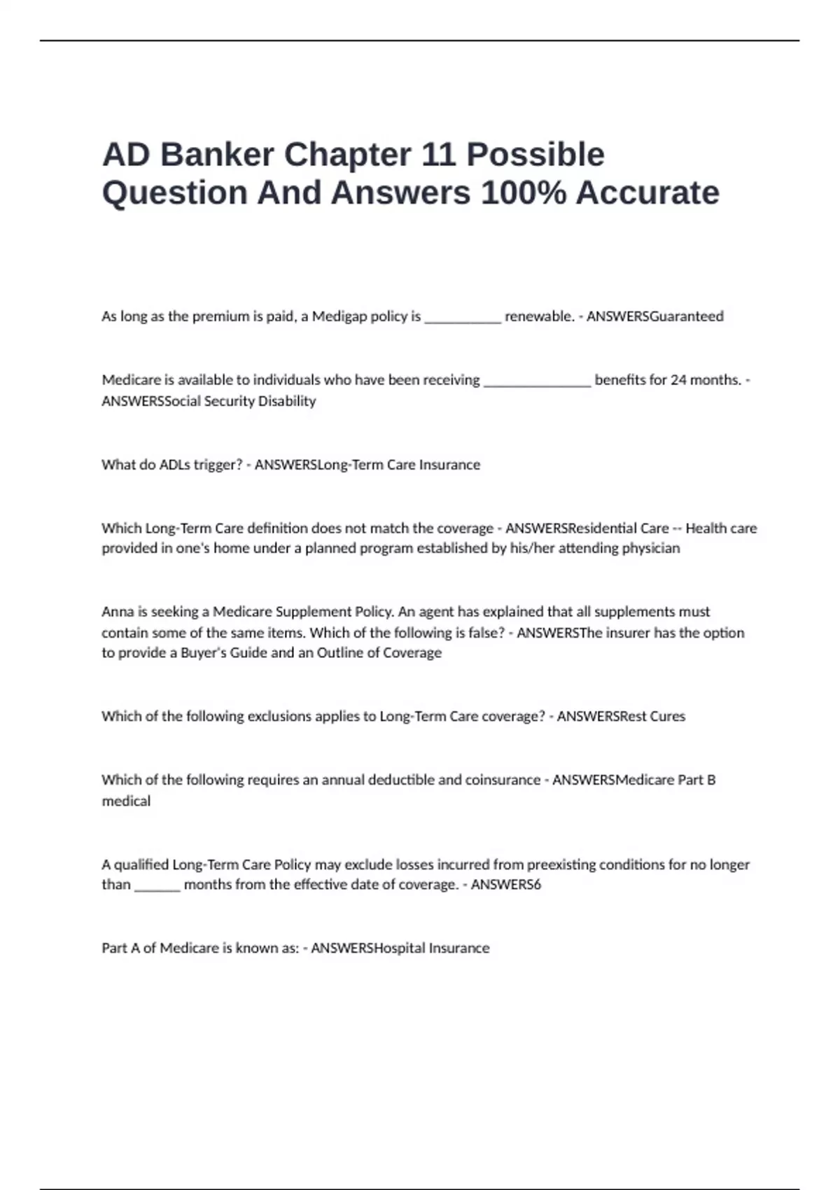 As long as the premium is paid, a Medigap policy is __________ renewable. - ANSWERSGuaranteed Medicare is available to individuals who have been receiving ______________ benefits for 24 months. - ANSWERSSocial Security Disability What do ADLs trigger? - ANSWERSLong-Term Care Insurance Which Long-Term Care definition does not match the coverage - ANSWERSResidential Care -- Health care provided in one's home under a planned program established by his/her attending physician Anna is seeking a Medicare Supplement Policy. An agent has explained that all supplements must contain some of the same items. Which of the following is false? - ANSWERSThe insurer has the option to provide a Buyer's Guide and an Outline of Coverage Which of the following exclusions applies to Long-Term Care coverage? - ANSWERSRest Cures Which of the following requires an annual deductible and coinsurance - ANSWERSMedicare Part B medical A qualified Long-Term Care Policy may exclude losses incurred from preexisting conditions for no longer than ______ months from the effective date of coverage. - ANSWERS6 Part A of Medicare is known as: - ANSWERSHospital Insurance If an individual is age 65 or over and continues to work, Medicare is usually the _________ insurer to any employer group health plan the individual participates in. - ANSWERSsecondary If an employer has less than ______ employees, Medicare will be the primary payer for those eligible for Medicare - ANSWERS20 If an individual is age ______ or over and continues to work, Medicare is usually the secondary insurer to any employer group health plan the individual participates in. - ANSWERS65 Medicare benefit payments are made to the medical provider - ANSWERSIf the benefit has been assigned Every LTC Policy that provides benefits of homecare or community-based services shall provide all of the following, except: - ANSWERSAcute care Which statement regarding Medicare is not true? - ANSWERSMedicare is the primary payor to any employer group health plan coverage Which of the following is not covered by a long-term care policy? - ANSWERSHospitalization Long-Term Care policies may not be written as which of the following? - ANSWERSShort-term policies A person who purchases a Medicare Supplement policy cannot enroll in Medicare Part _________. - ANSWERSC Home Health Care benefits under a LTC Policy may be limited or excluded by: - ANSWERSExcluding benefits for conditions caused by war or acts of war A Medicare Supplement or LTC policy's free look period is: - ANSWERS30 days If an employee is age 65 and still working, which of the following statements is correct? - ANSWERSThe older employee must be offered the same benefits as younger employees The Initial Enrollment Period for Medicare is 7 months in length. Which of the following are the start and stop dates for this period? - ANSWERSThe 1st day of the 3rd month before the individual turns age 65 and the last day of the 3rd month after the month the individual turns age 65 A program designed to provide increased assistance to those who are unable to pay for their medical needs is known as: - ANSWERSMedicaid If an individual has limited assets and low income, which of the following would most likely cover the cost of long-term care? - ANSWERSMedicaid Randy has a preexisting condition for which coverage has been excluded since his Medicare Supplement Policy became effective 4 months ago. If Randy were to replace his Medicare Supplement Policy, what could be said about the preexisting condition under the new policy? - ANSWERSThe exclusion will be waived to the extent it has already been satisfied under the original policy Medicare is available to individuals who have been receiving ______________ benefits for 24 months. - ANSWERSSocial Security Disability All of the following are exclusions under an LTC policy, except: - ANSWERSChemical dependency on one's own prescription drugs All the following qualify for Medicare Part A, except: - ANSWERSHealthy individuals who are under age 65 and not covered by Social Security, but are willing to pay the Part A premium Originally, Medicare was for U.S. citizens age _______ and over. - ANSWERS65 Which of the following requires an annual deductible and coinsurance? - ANSWERSMedicare Part B medical Any policy designed to provide coverage for not less than 12 consecutive months for diagnostic, preventive, therapeutic, rehabilitative, maintenance, or personal care services provided in a setting other than an acute care unit of a hospital is the definition of: - ANSWERSLong-Term Care An insurer offering Medicare Supplements to senior clients must: - ANSWERSOffer Core Benefit Plan A if it sells any of the other plans Which type of LTC coverage is designed to provide relief for the primary caregiver of a long-term care patient? - ANSWERSRespite Care Medicare benefit payments are made to the medical provider: - ANSWERSIf the benefit has been assigned Which of the following is correct concerning an LTC policy? - ANSWERSIt may define a preexisting condition as a condition for which advice or treatment was recommended or received within 6 months of the effective date of coverage The _________ include bathing, continence, dressing, eating, toileting, and transferring - ANSWERSActivities of Daily Living If an individual starts receiving Social Security retirement benefits at age 62, when are they eligible for Part A benefits? - ANSWERSAutomatically at age 65 Overseas foreign travel emergency coverage is a Medicare supplement: - ANSWERSAdditional benefit What type of Long-Term Care policy can be renewable and convertible, and can also be purchased at lower rates than for individual coverage? - ANSWERSAn Employer Group Policy The Medicare Supplement Right of Return Provision (Free Look Period) allows the buyer a period of ________ to return a policy and receive a full refund. - ANSWERS30 Medicaid is a federal program that is administered by the _______ government. - ANSWERSState Overseas foreign tr
