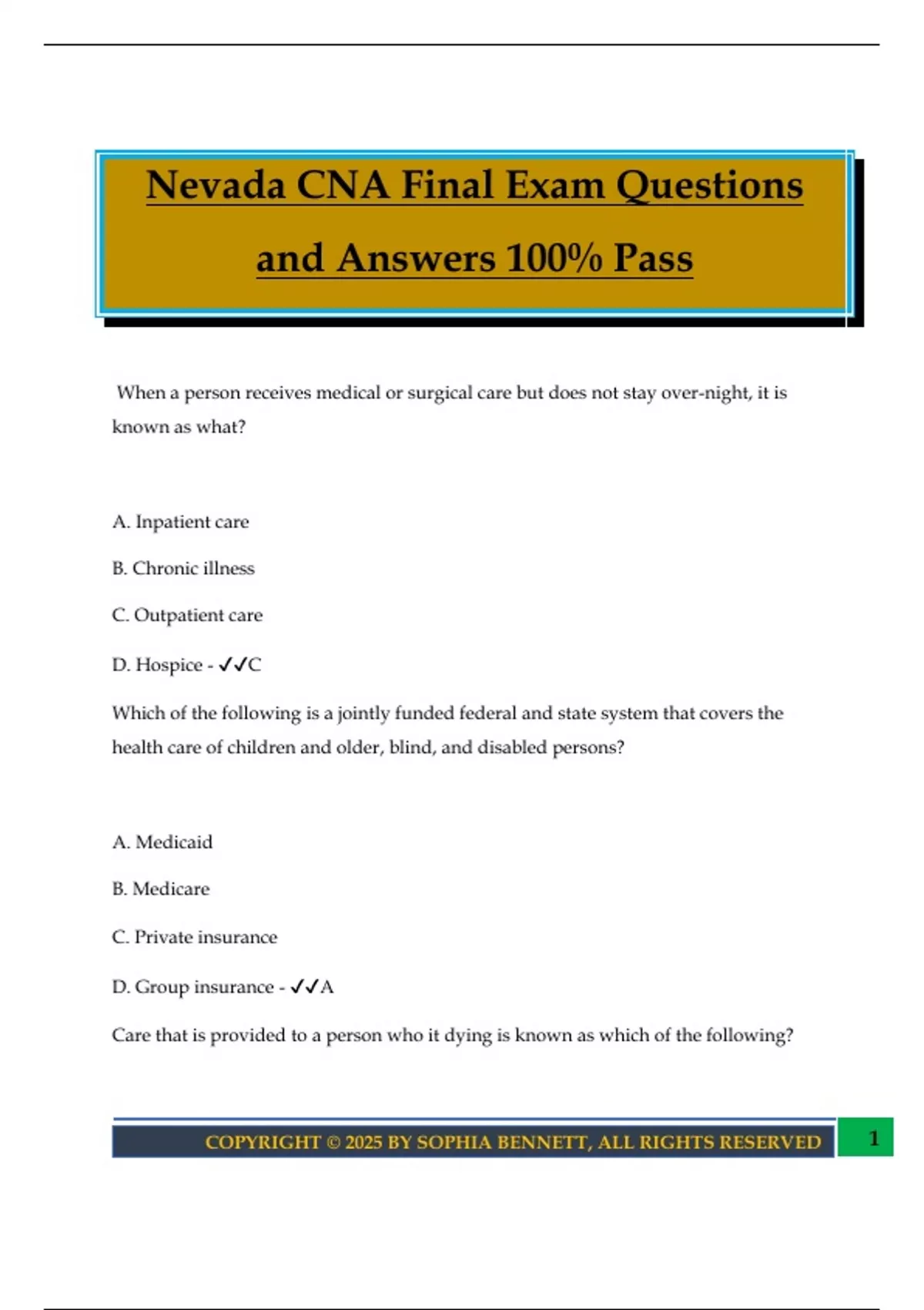 Nevada CNA Final Exam Questions and Answers 100% Pass When a person receives medical or surgical care but does not stay over-night, it is known as what? A. Inpatient care B. Chronic illness C. Outpatient care D. Hospice - C Which of the following is a jointly funded federal and state system that covers the health care of children and older, blind, and disabled persons? A. Medicaid B. Medicare C. Private insurance D. Group insurance - A Care that is provided to a person who it dying is known as which of the following? 2COPYRIGHT © 2025 BY SOPHIA BENNETT, ALL RIGHTS RESERVED A. Acute care B. Long-term care C. Assisted living D. Hospice - D A memory care unit is used for which of these conditions? A. Alzheimer's disease B. Death and dying C. Mental health D. Rehabilitation - A Which of the following purposes of health care is accomplished when a person learns about healthy living? A. Health promotion B. Disease prevention C. Treatment of disease D. Rehabilitation - A What is a sudden illness from which a person is expected to recover? A. Chronic illness 3COPYRIGHT © 2025 BY SOPHIA BENNETT, ALL RIGHTS RESERVED B. Acute illness C. Terminal illness D. Palliative illness - A What is a registered nurse with limited diagnosing and prescribing functions? A. Director of nursing B. Licensed practical nurse C. Case manager D. Nurse practitioner - D What is the focus of care in any health care agency? A. Reimbursement B. Caregivers C. Staff members D. The person - D What is the role of the nursing case manager? A. Focuses on tasks and jobs. B. Delegates care of patient to other nurses and nursing assistants. C. Coordinates care of specific groups of patients from admission through discharge. 4COPYRIGHT © 2025 BY SOPHIA BENNETT, ALL RIGHTS RESERVED D. Provides total patient care. - C What is one of the requirements for being the director of nursing (DON) within an organization? A. The DON is an RN. B. The DON is a licensed vocational nurse. C. The DON has a business or law degree. D. The DON has an associate's degree in nursing. - A What does the resident have the right to refuse? A. Privacy B. Treatment C. Nutrition D. Confidentiality - B What is the most appropriate way to address