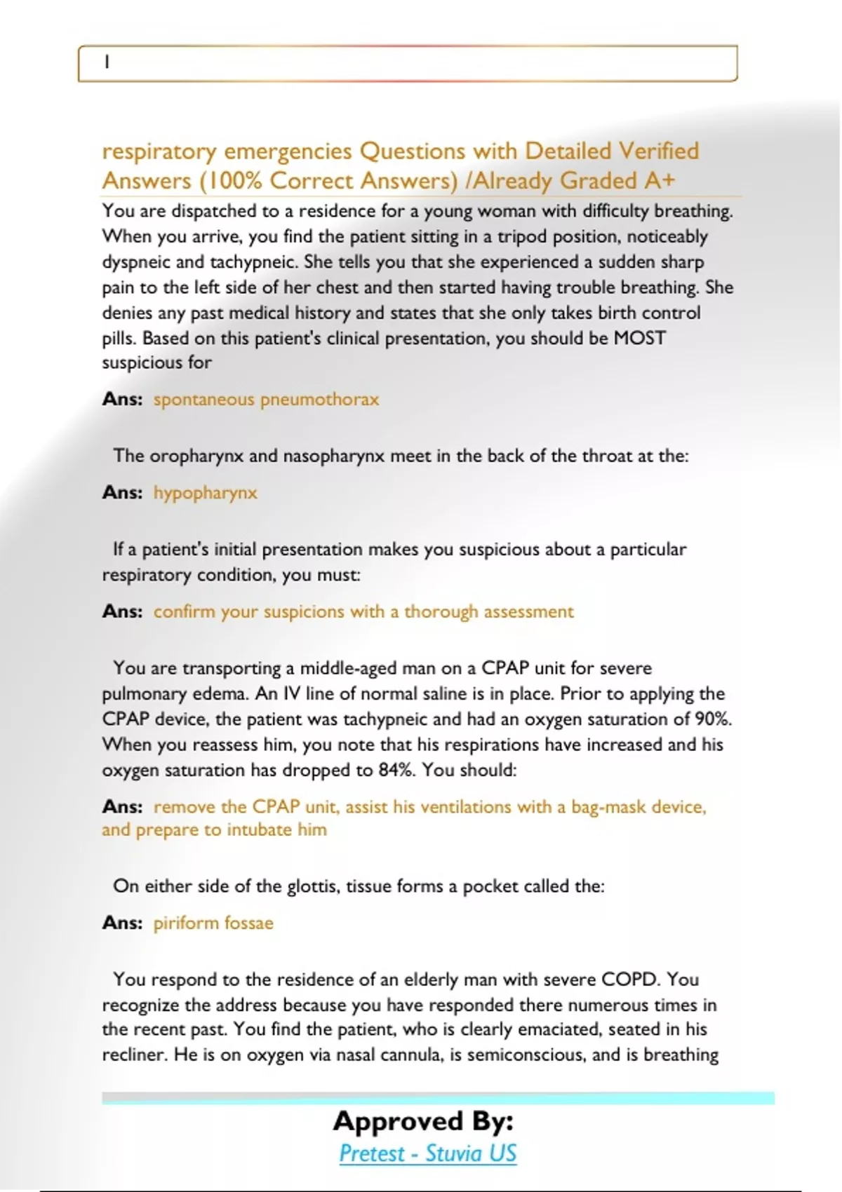 respiratory emergencies Questions with Detailed Verified Answers (100% Correct Answers) /Already Graded A+