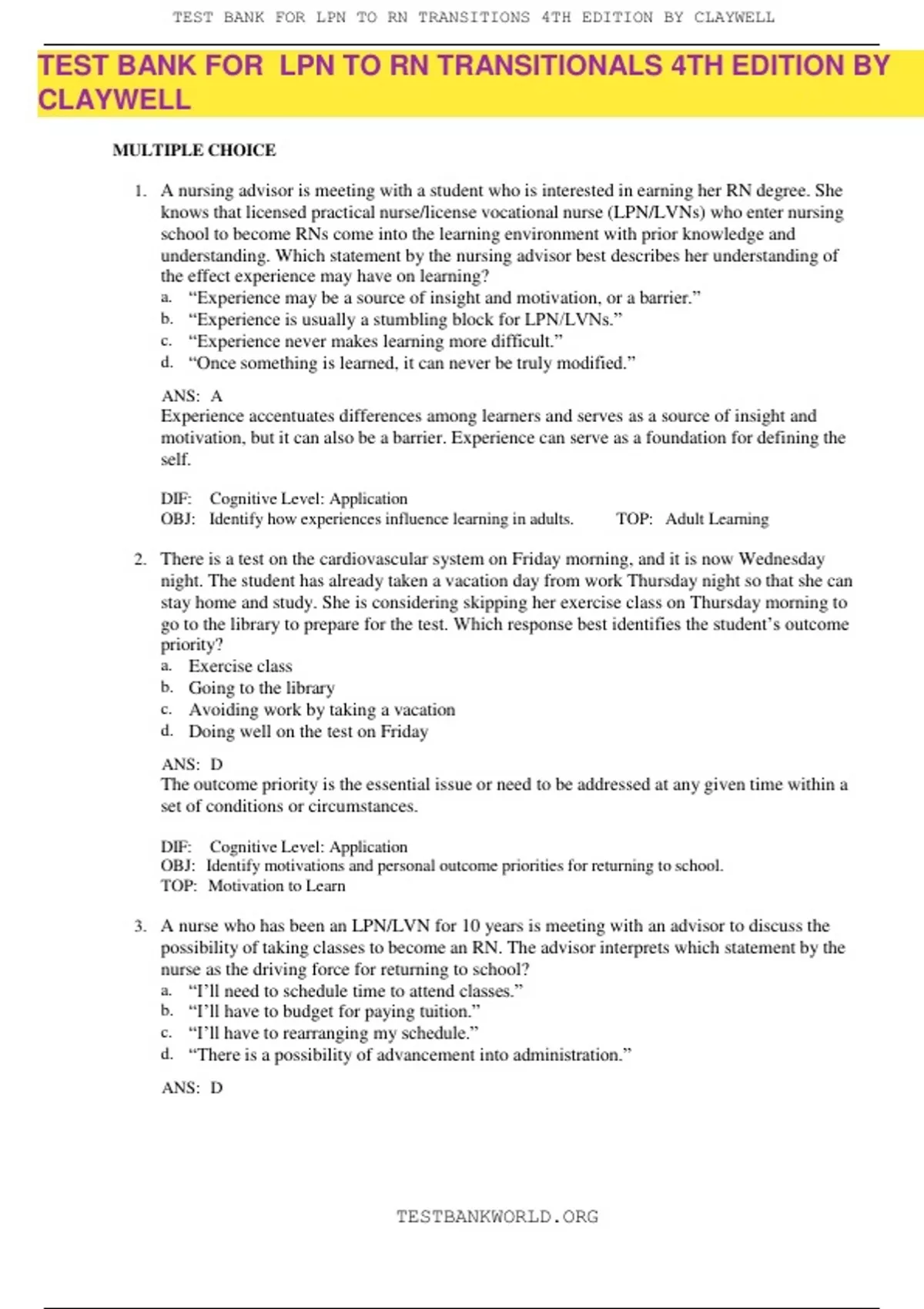 TEST BANK FOR LPN TO RN TRANSITIONS 4TH EDITION BY CLAYWELL