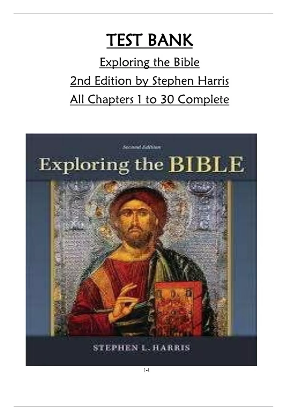 TEST BANK for Exploring the Bible 2nd Edition by Stephen Harris All Chapters 1 to 30 Complete Test Bank for Exploring the Bible 2e 2nd Edition by Stephen Harris. Full Chapters test bank are included - Chapter 1 to 39 Part One An Introduction to the Bible and the Biblical World Chapter 1 The Bible: An Overview Chapter 2 How the Bible Was Created: Transmission, Canonization, and Translation Chapter 3 The Ancient Near East: The Environment That Produced the Bible Part Two The Torah (Divine Instruction) Chapter 4 The Five Books of Torah (the Pentateuch): Themes and Theories Chapter 5 In the Beginning: The Book of Genesis Chapter 6 Freedom and Responsibility: The Book of Exodus Chapter 7 Law, Holiness, and Rebellion: The Books of Leviticus and Numbers Chapter 8 A New Vision of Moses’ Teaching: The Book of Deuteronomy Part Three The Prophets I Chapter 9 The Story of Ancient Israel: How the Promised Land Was Gained and Lost Chapter 10 Faith and War: The Book of Joshua Chapter 11 Yahweh’s Warriors: The Book of Judges Chapter 12 The Rise of David and the Birth of a Kingdom: The Books of 1 and 2 Samuel Chapter 13 From the Glory of Solomon to Exile in Babylon: The Books of 1 and 2 Kings Part Four The Prophets II Chapter 14 Israel’s Spokespersons for God Chapter 15 Prophets to the Northern Kingdom: The Oracles of Amos and Hosea Chapter 16 Prophets of the Assyrian Threat: The Oracles of Isaiah, Micah, Zephaniah, and Nahum Chapter 17 Prophets of the Babylonian Crisis: The Oracles of Jeremiah, Habakkuk, and Obadiah Chapter 18 Prophets in Exile: The Oracles of Ezekiel and Second Isaiah Chapter 19 After the Exile—Israel’s Last Prophets: The Oracles of Haggai, Zechariah, Third Isaiah, Joel, Malachi, and Jonah Part Five The Writings Chapter 20 After the Exile: Israel’s Changing Life with God Chapter 21 The Postexilic Readjustment: The Books of Ezra and Nehemiah Chapter 22 Worshiping at the Second Temple: Hebrew Poetry and the Book of Psalms Chapter 23 Israel’s Wisdom Writers: The Books of Proverbs, Job, and Ecclesiastes Chapter 24 Festival Scrolls: The Books of Ruth, Song of Songs, Lamentations, and Esther Chapter 25 Reinterpreting Israel’s History: The Books of 1 and 2 Chronicles Chapter 26 Keeping God’s Law in a Hostile World: Revolt of the Maccabees and the Book of Daniel Chapter 27 The Second Canon: Books of the Apocrypha Part Six The New Testament Chapter 28 The World in Which Christianity Originated: Roman Power, Greek Culture, and the Cult of Deified Rulers Chapter 29 First-Century Judaism: Diversity, Messianic Expectations, and the Birth of Christianity Chapter 30 Telling Jesus’ Story: The Gospel of Mark Chapter 31 The Synoptic Problem: The Gospel of Matthew and Its Relationship to the Gospels of Mark and Luke Chapter 32 Jesus as a Savior for “All Nations”: The Gospel of Luke Chapter 33 Another Way of Telling Jesus’ Story: The Gospel of John Chapter 34 An Account of Early Christianity: The Book of Acts Chapter 35 Paul and the Gentile Mission: Letters to Churches at Thessalonica, Corinth, Galatia, Rome, Philippi, and Colossae Chapter 36 Continuing the Pauline Tradition: Second Thessalonians, Colossians, Ephesians, and the Pastoral Epistles Chapter 37 General Letters on Faith and Behavior: Hebrews and the Catholic Epistles Chapter 38 Continuing the Apocalyptic Hope: The Book of Revelation Chapter 39 Our Biblical Legacy: Evolving