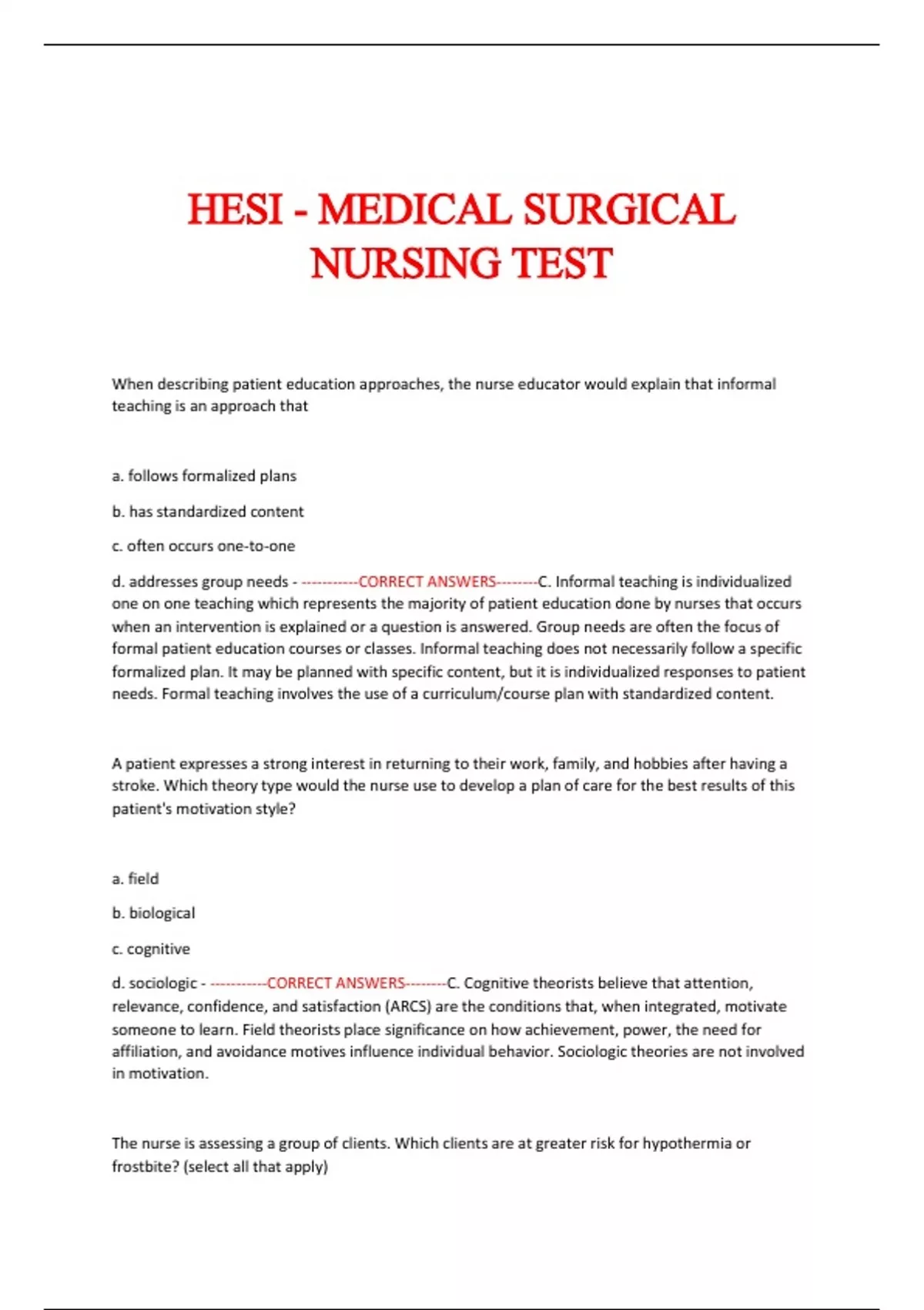 HESI - MEDICAL SURGICAL NURSING TEST HESI - MEDICAL SURGICAL NURSING TEST HESI - MEDICAL SURGICAL NURSING TEST