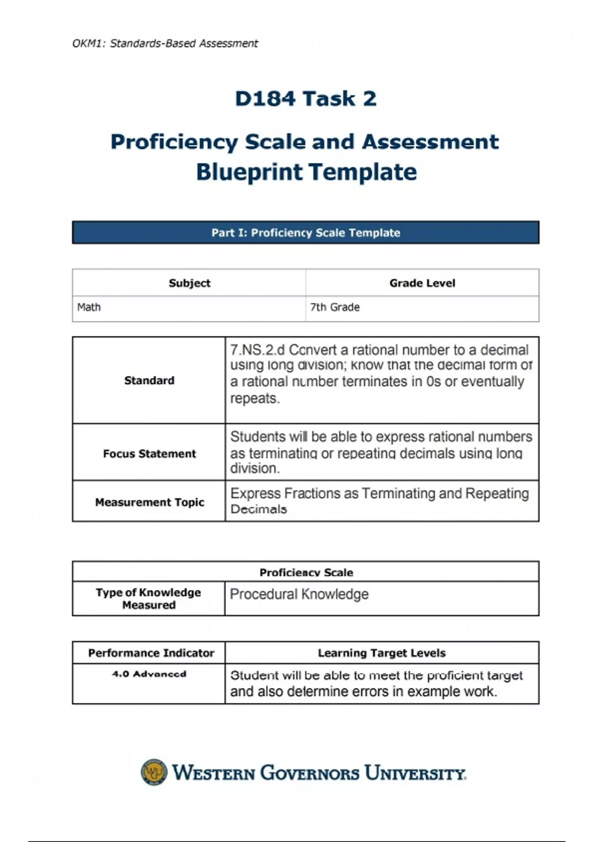 D184 Task 2 Proficiency Scale and Assessment Blueprint Template