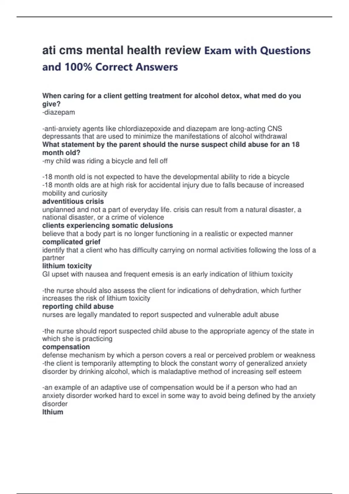 ati cms mental health review Exam with Questions and 100% Correct Answers