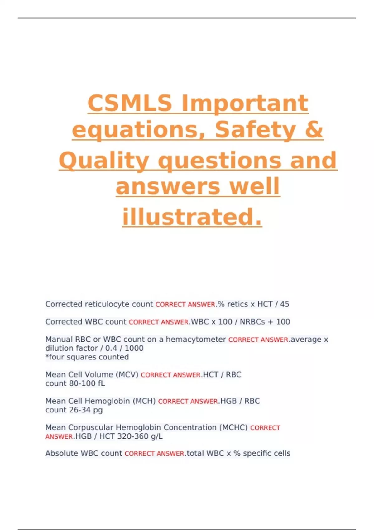 CSMLS Important equations, Safety & Quality questions and answers well illustrated.