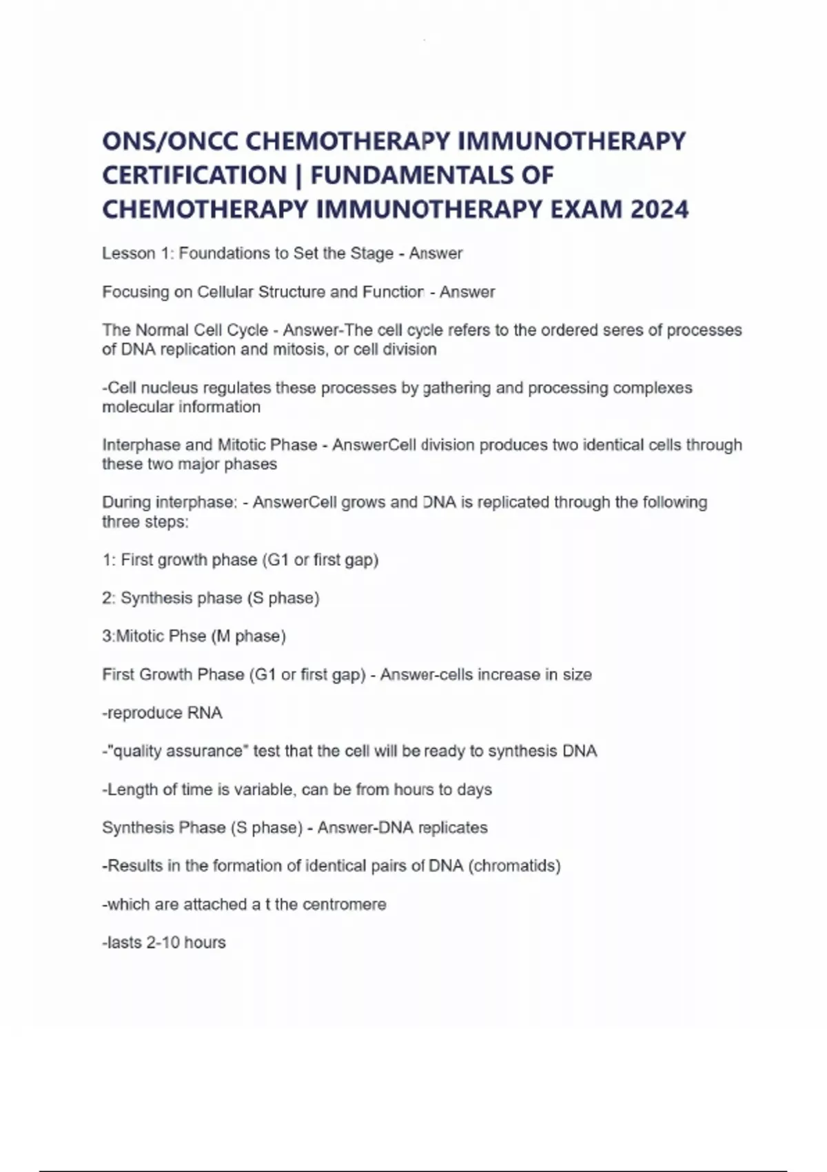 ONS/ONCC CHEMOTHERAPY IMMUNOTHERAPY CERTIFICATION | FUNDAMENTALS OF CHEMOTHERAPY IMMUNOTHERAPY EXAM 2024 Lesson 1: Foundations to Set the Stage - Answer Focusing on Cellular Structure and Function - Answer The Normal Cell Cycle - Answer-The cell cycle refers to the ordered seres of processes of DNA replication and mitosis, or cell division -Cell nucleus regulates these processes by gathering and processing complexes molecular information Interphase and Mitotic Phase - AnswerCell division produces two identical cells through these two major phases During interphase: - AnswerCell grows and DNA is replicated through the following three steps: 1: First growth phase (G1 or first gap) 2: Synthesis phase (S phase) 3:Mitotic Phse (M phase) First Growth Phase (G1 or first gap) - Answer-cells increase in size -reproduce RNA -"quality assurance" test that the cell will be ready to synthesis DNA -Length of time is variable, can be from hours to days Synthesis Phase (S phase) - Answer-DNA replicates -Results in the formation of identical pairs of DNA (chromatids) -which are attached a t the centromere -lasts 2-10 hours Mitotic Phase (M phase) - Answer-Replicated chromosomes are aligned, separated, and move into 2 new, identical daughter cells