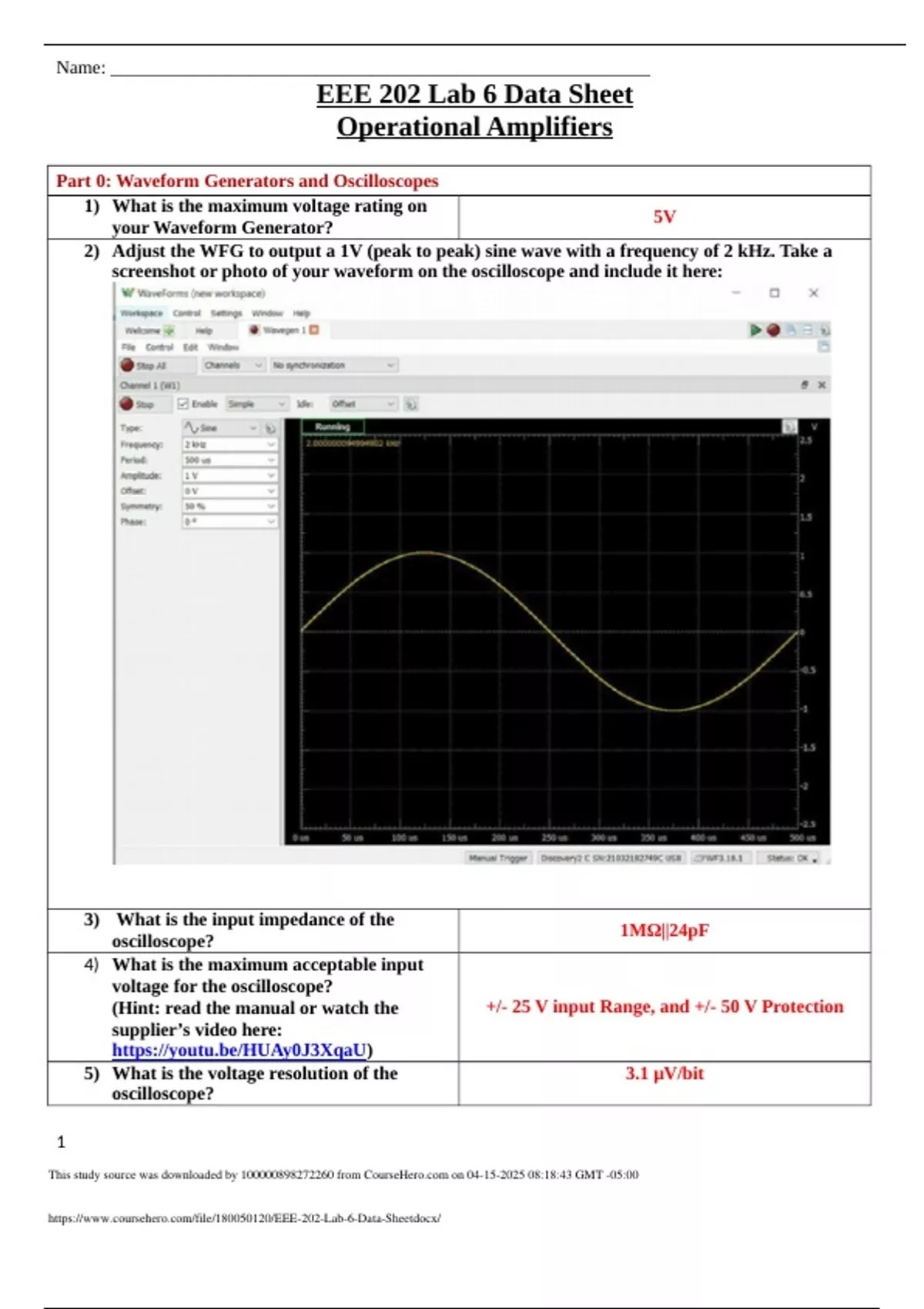 EEE 202 Lab 6 Data Sheet Operational Amplifiers | Verified with 100% Correct Answers