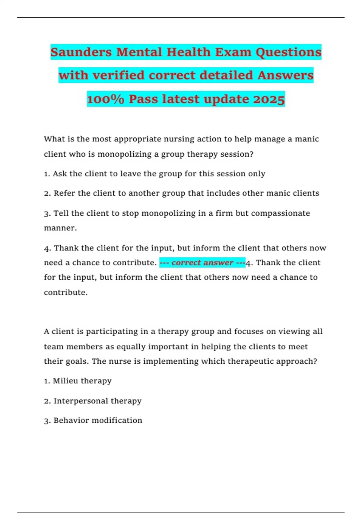 Saunders Mental Health Exam Questions with verified correct detailed Answers 100% Pass latest update 2025 What is the most appropriate nursing action to help manage a manic client who is monopolizing a group therapy session? 1. Ask the client to leave the group for this session only 2. Refer the client to another group that includes other manic clients 3. Tell the client to stop monopolizing in a firm but compassionate manner. 4. Thank the client for the input, but inform the client that others now need a chance to contribute. --- correct answer ---4. Thank the client for the input, but inform the client that others now need a chance to contribute. A client is participating in a therapy group and focuses on viewing all team members as equally important in helping the clients to meet their goals. The nurse is implementing which therapeutic approach? 1. Milieu therapy 2. Interpersonal therapy 3. Behavior modification 4. Support group therapy --- correct answer ---1. Milieu therapy