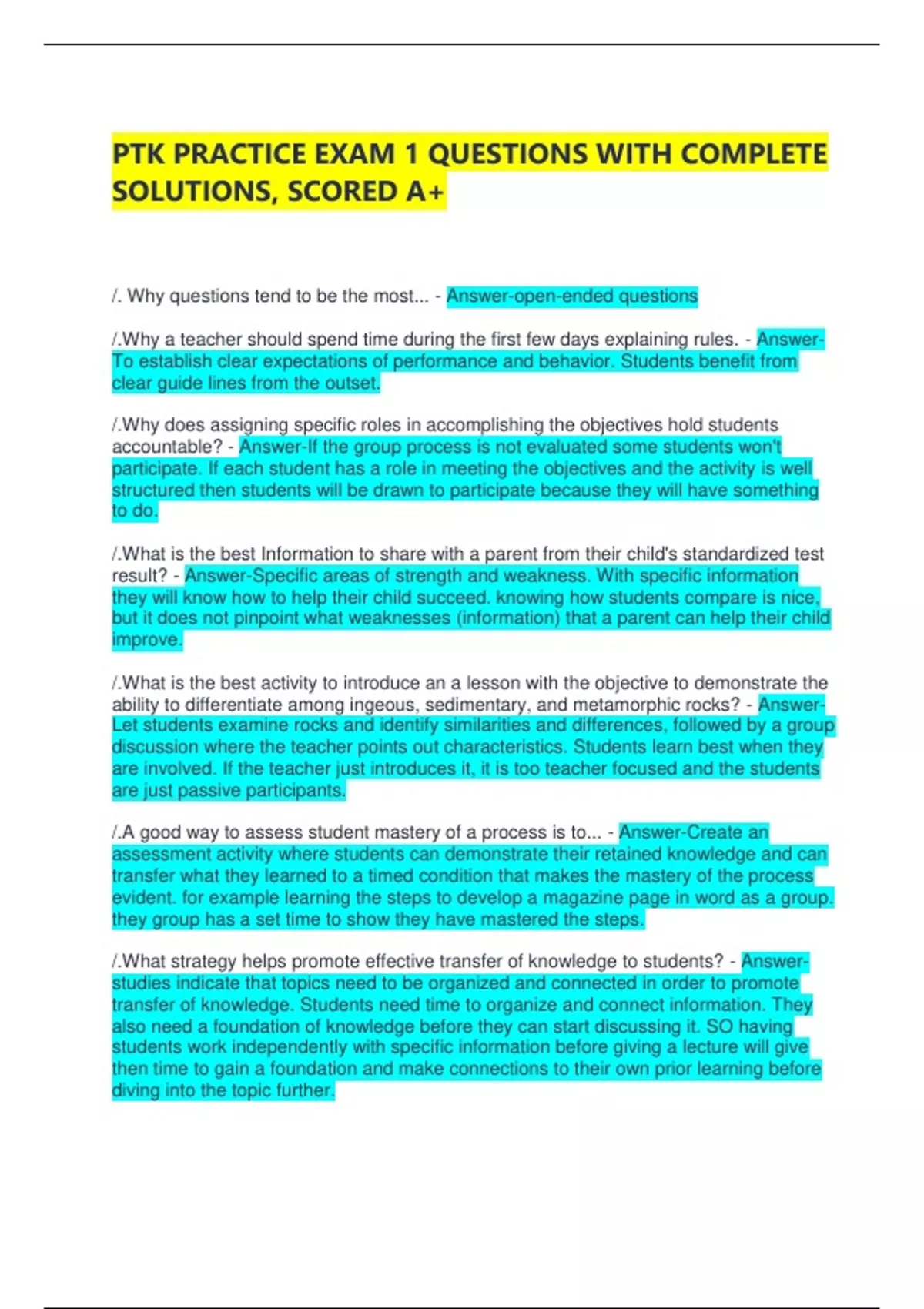 PTK PRACTICE EXAM 1 QUESTIONS WITH COMPLETE SOLUTIONS, SCORED A+ /. Why questions tend to be the most... - Answer-open-ended questions /.Why a teacher should spend time during the first few days explaining rules. - Answer-To establish clear expectations of performance and behavior. Students benefit from clear guide lines from the outset. /.Why does assigning specific roles in accomplishing the objectives hold students accountable? - Answer-If the group process is not evaluated some students won't participate. If each student has a role in meeting the objectives and the activity is well structured then students will be drawn to participate because they will have something to do. /.What is the best Information to share with a parent from their child's standardized test result? - Answer-Specific areas of strength and weakness. With specific information they will know how to help their child succeed. knowing how students compare is nice, but it does not pinpoint what weaknesses (information) that a parent can help their child improve. /.What is the best activity to introduce an a lesson with the objective to demonstrate the ability to differentiate among ingeous, sedimentary, and metamorphic rocks? - Answer-Let students examine rocks and identify similarities and differences, followed by a group discussion where the teacher points out characteristics. Students learn best when they are involved. If the teacher just introduces it, it is too teacher focused and the students are just passive participants. /.A good way to assess student mastery of a process is to... - Answer-Create an assessment activity where students can demonstrate their retained knowledge and can transfer what they learned to a timed condition that makes the mastery of the process evident. for example learning the steps to develop a magazine page in word as a group. they group has a set time to show they have mastered the steps. /.What strategy helps promote effective transfer of knowledge to students? - Answer-studies indicate that topics need to be organized and connected in order to promote transfer of knowledge. Students need time to organize and connect information. They also need a foundation of knowledge before they can start discussing it. SO having students work independently with specific information before giving a lecture will give then time to gain a foundation and make connections to their own prior learning before diving into the topic further. /.organizational structures help students... - Answer-connect and remember /.The best way for students to review for a test. - Answer-Students making a chart with important topics and notes with subtopics. NOT a game, review of notes or homework, or taking test type questions. /.Bloom's Taxonomy - Answer-knowledge, comprehension, application, analysis, synthesis, evaluation /.An example of a learning objective that uses a higher order thinking skill? - Answer-The student will create a metaphor to describe an emotion. /.Best way to introduce a process like writing bibliographic references... - Answer-Demonstrate to students the specific procedure and order expected. /.Vocabulary should be taught... - Answer-in every subject area in order for students to master the subject matter. The English department cannot possibly teach all of the vocabulary intrinsic to a particular subject. /.Why is it a good practice for a teacher to ask a question and have students wait and raise their hand when they think they have an answer (not call out answers)? - Answer-Students need various amounts of time to think about complicated questions. immediate answers stop the thinking process. WAIT TIME. students should be given plenty of time to come up with their own ideas. /.divergant thinking - Answer-The process of mentally taking a single idea and expanding it in several directions. Example: What are some ways our country might solve the problems of poverty? This question can go several directions. In contrast to the convergent question; What does the textbook say might solve the problems of poverty? /.convergent question - Answer-A question that has a specific answer. Example : what does the textbook say the answer is? /.A teacher should generally begin almost every class by... - Answer-by telling students what they will be covering that day. Telling students what they will be covering helps focus their attention. /.Why is student engagement important? - Answer-Students engaged in active participation are more likely to learn and understand complex interconnections. /.Best practice to help students understand why Native American tribes had different trading practices... - Answer-Assign a tribe to each group of students and give each group handouts that identify needs and oversupply for a particular tribe. Then stage trading activities among groups and have students identify important aspects.