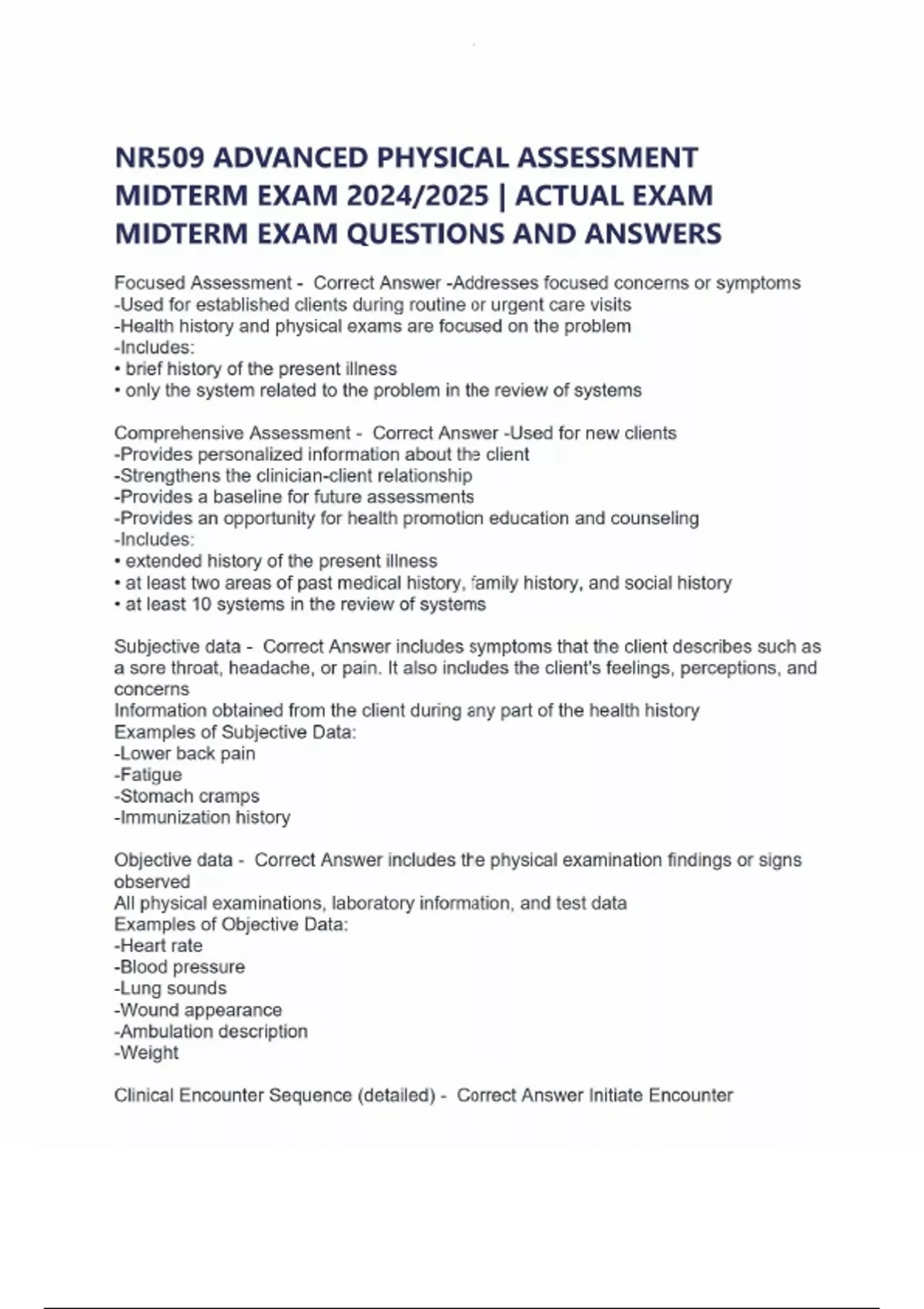 NR509 ADVANCED PHYSICAL ASSESSMENT MIDTERM EXAM 2024/2025 | ACTUAL EXAM MIDTERM EXAM QUESTIONS AND ANSWERS Focused Assessment - Correct Answer -Addresses focused concerns or symptoms -Used for established clients during routine or urgent care visits -Health history and physical exams are focused on the problem -Includes: • brief history of the present illness • only the system related to the problem in the review of systems Comprehensive Assessment - Correct Answer -Used for new clients -Provides personalized information about the client -Strengthens the clinician-client relationship -Provides a baseline for future assessments -Provides an opportunity for health promotion education and counseling -Includes: • extended history of the present illness • at least two areas of past medical history, family history, and social history • at least 10 systems in the review of systems Subjective data - Correct Answer includes symptoms that the client describes such as a sore throat, headache, or pain. It also includes the client's feelings, perceptions, and concerns Information obtained from the client during any part of the health history Examples of Subjective Data: -Lower back pain -Fatigue -Stomach cramps -Immunization history Objective data - Correct Answer includes the physical examination findings or signs observed All physical examinations, laboratory information, and test data Examples of Objective Data: -Heart rate -Blood pressure -Lung sounds -Wound appearance -Ambulation description -Weight Clinical Encounter Sequence (detailed) - Correct Answer Initiate Encounter