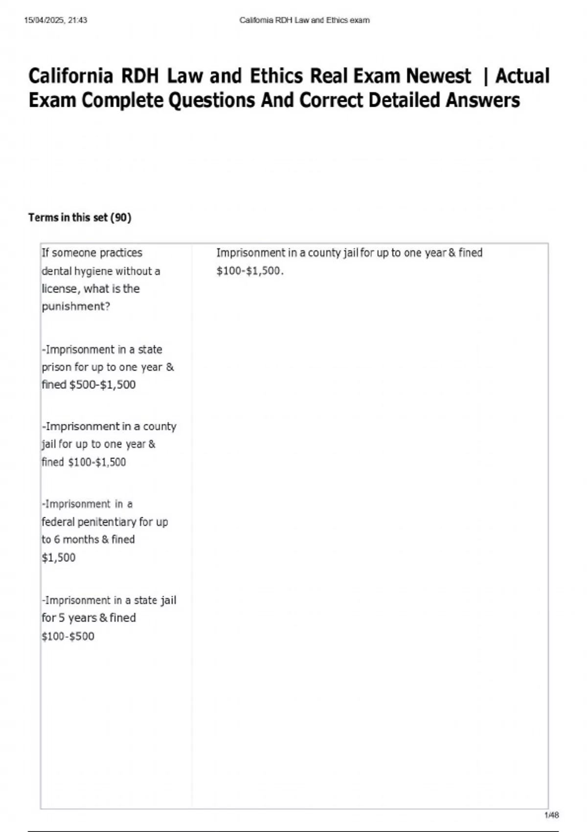 California RDH Law and Ethics Real Exam Newest | Actual Exam Complete Questions And Correct Detailed Answers If someone practices dental hygiene without a license, what is the punishment? Imprisonment in a county jail for up to one year & fined $100-$1,500. -Imprisonment in a state prison for up to one year & fined $500-$1,500 -Imprisonment in a county jail for up to one year & fined $100-$1,500 -Imprisonment in a federal penitentiary for up to 6 months & fined $1,500 -Imprisonment in a state jail for 5 years & fined $100-$500