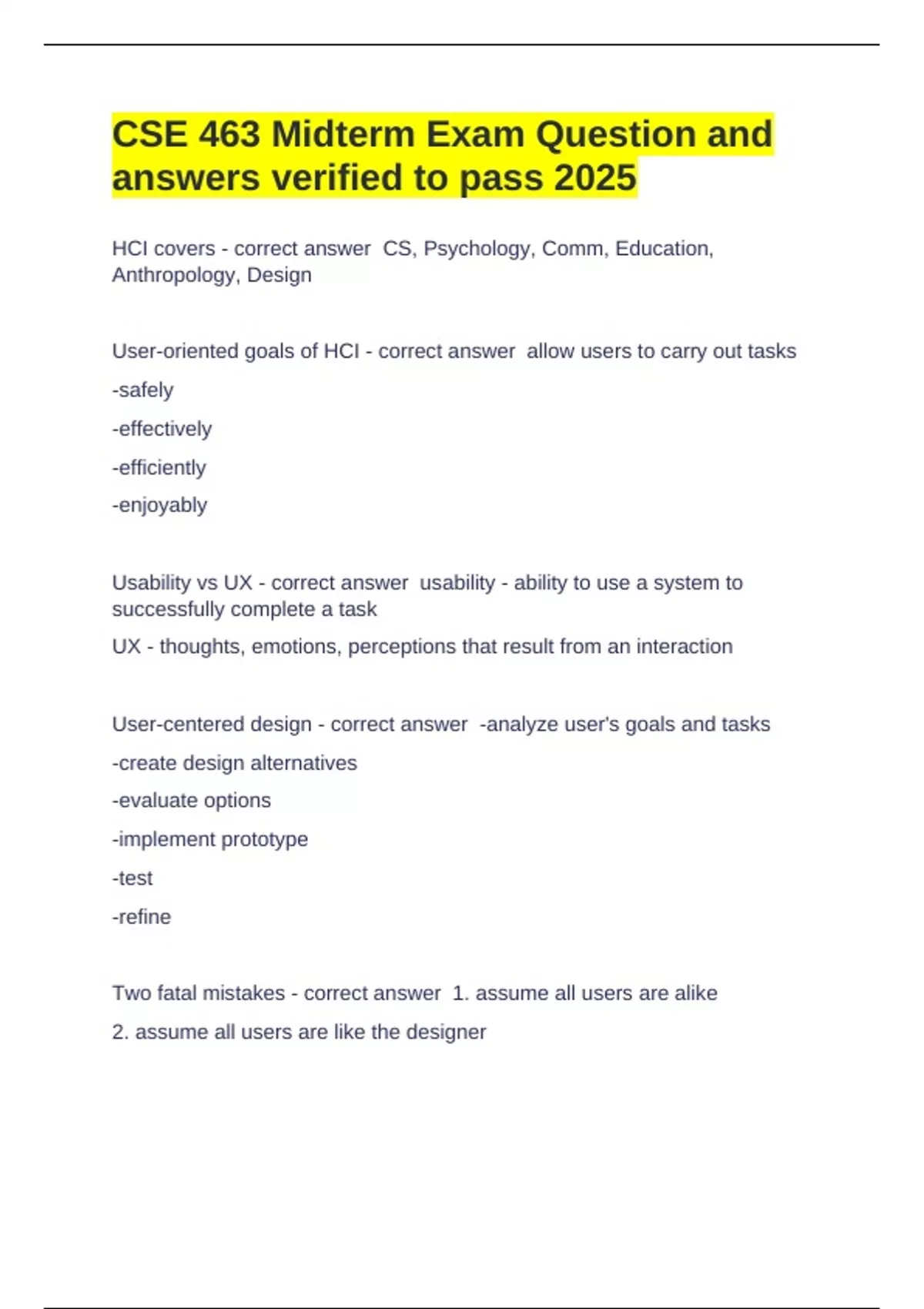 CSE 463 Midterm Exam Question and answers verified to pass 2025 HCI covers - correct answer CS, Psychology, Comm, Education, Anthropology, Design User-oriented goals of HCI - correct answer allow users to carry out tasks -safely -effectively -efficiently -enjoyably Usability vs UX - correct answer usability - ability to use a system to successfully complete a task UX - thoughts, emotions, perceptions that result from an interaction User-centered design - correct answer -analyze user's goals and tasks -create design alternatives -evaluate options -implement prototype -test -refine