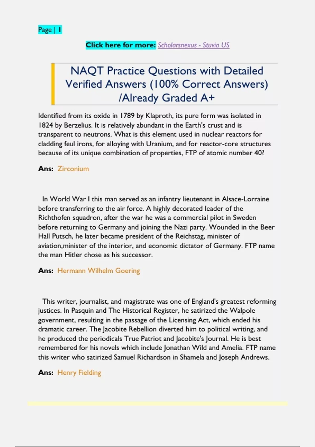 NAQT Practice Questions with Detailed Verified Answers (100% Correct Answers) /Already Graded A+