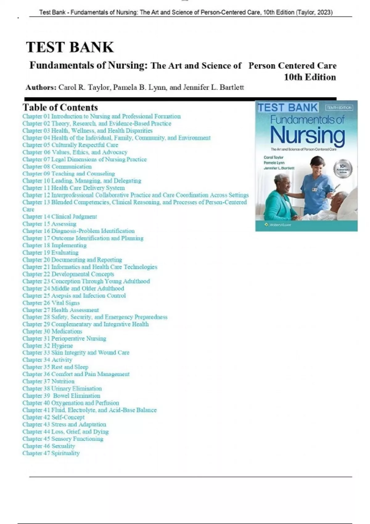 Test Bank For Fundamentals of Nursing: The Art and Science of Person-Centered Care 10th Edition by Carol R. Taylor, Pamela B Lynn & Jennifer L Bartlett| 9781975168162| All Chapters 1-47 ||Complete A+ Guide