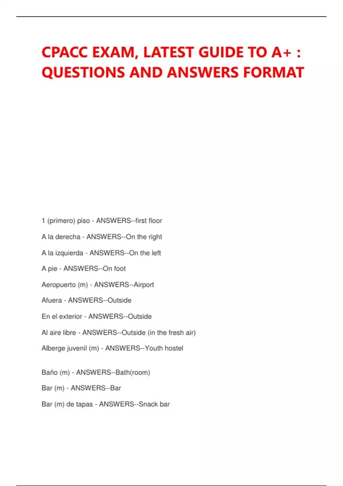 CPACC EXAM, LATEST GUIDE TO A+ : QUESTIONS AND ANSWERS FORMAT 1 (primero) piso - ANSWERS--first floor A la derecha - ANSWERS--On the right A la izquierda - ANSWERS--On the left A pie - ANSWERS--On foot Aeropuerto (m) - ANSWERS--Airport Afuera - ANSWERS--Outside En el exterior - ANSWERS--Outside Al aire libre - ANSWERS--Outside (in the fresh air) Alberge juvenil (m) - ANSWERS--Youth hostel Baño (m) - ANSWERS--Bath(room) Bar (m) - ANSWERS--Bar Bar (m) de tapas - ANSWERS--Snack bar