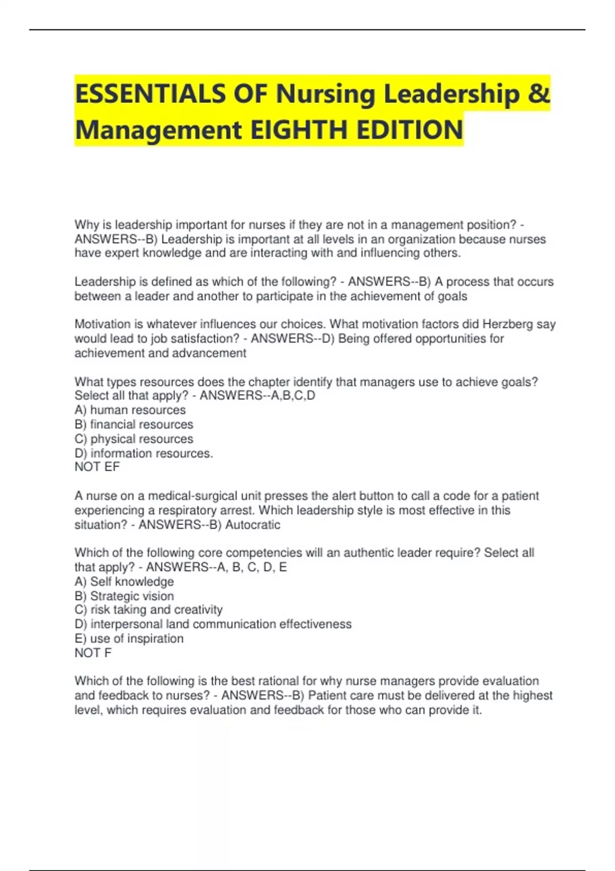 ESSENTIALS OF Nursing Leadership & Management EIGHTH EDITION Why is leadership important for nurses if they are not in a management position? - ANSWERS--B) Leadership is important at all levels in an organization because nurses have expert knowledge and are interacting with and influencing others. Leadership is defined as which of the following? - ANSWERS--B) A process that occurs between a leader and another to participate in the achievement of goals Motivation is whatever influences our choices. What motivation factors did Herzberg say would lead to job satisfaction? - ANSWERS--D) Being offered opportunities for achievement and advancement What types resources does the chapter identify that managers use to achieve goals? Select all that apply? - ANSWERS--A,B,C,D A) human resources B) financial resources C) physical resources D) information resources. NOT EF