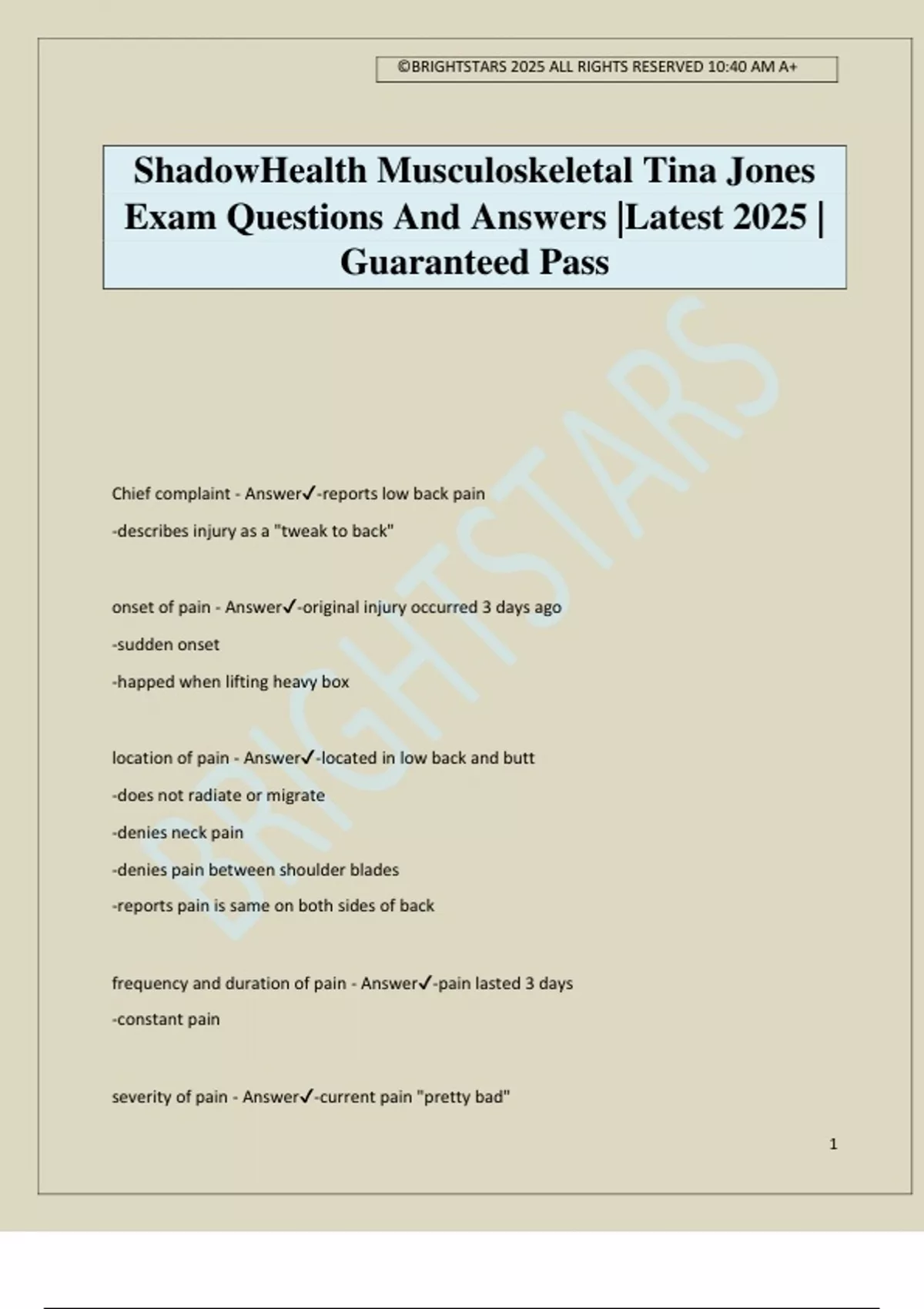 ©BRIGHTSTARS 2025 ALL RIGHTS RESERVED 10:40 AM A+ 1 ShadowHealth Musculoskeletal Tina Jones Exam Questions And Answers |Latest 2025 | Guaranteed Pass Chief complaint - Answer-reports low back pain -describes injury as a "tweak to back" onset of pain - Answer-original injury occurred 3 days ago -sudden onset -happed when lifting heavy box location of pain - Answer-located in low back and butt -does not radiate or migrate -denies neck pain -denies pain between shoulder blades -reports pain is same on both sides of back frequency and duration of pain - Answer-pain lasted 3 days -constant pain severity of pain - Answer-current pain "pretty bad"