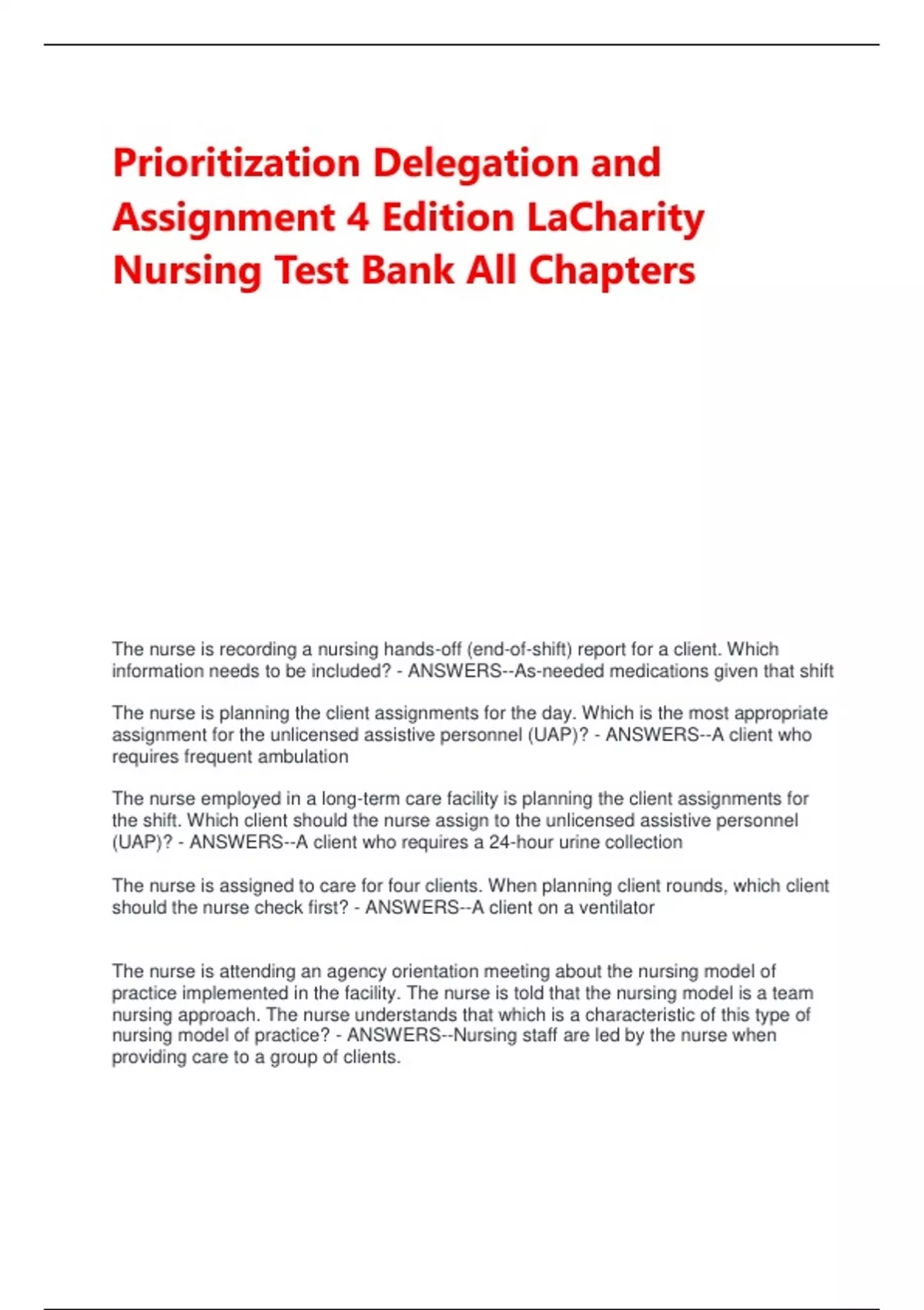 Prioritization Delegation and Assignment 4 Edition LaCharity Nursing Test Bank All Chapters The nurse is recording a nursing hands-off (end-of-shift) report for a client. Which information needs to be included? - ANSWERS--As-needed medications given that shift The nurse is planning the client assignments for the day. Which is the most appropriate assignment for the unlicensed assistive personnel (UAP)? - ANSWERS--A client who requires frequent ambulation The nurse employed in a long-term care facility is planning the client assignments for the shift. Which client should the nurse assign to the unlicensed assistive personnel (UAP)? - ANSWERS--A client who requires a 24-hour urine collection The nurse is assigned to care for four clients. When planning client rounds, which client should the nurse check first? - ANSWERS--A client on a ventilator