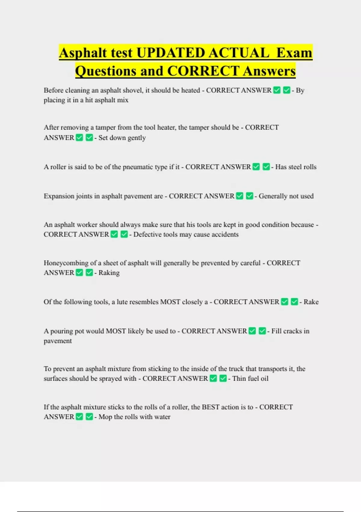Asphalt test UPDATED ACTUAL Exam Questions and CORRECT Answers Before cleaning an asphalt shovel, it should be heated - CORRECT ANSWER placing it in a hit asphalt mix After removing a tamper from the tool heater, the tamper should be - CORRECT ANSWER - Set down gently A roller is said to be of the pneumatic type if it - CORRECT ANSWER - By - Has steel rolls Expansion joints in asphalt pavement are - CORRECT ANSWER - Generally not used