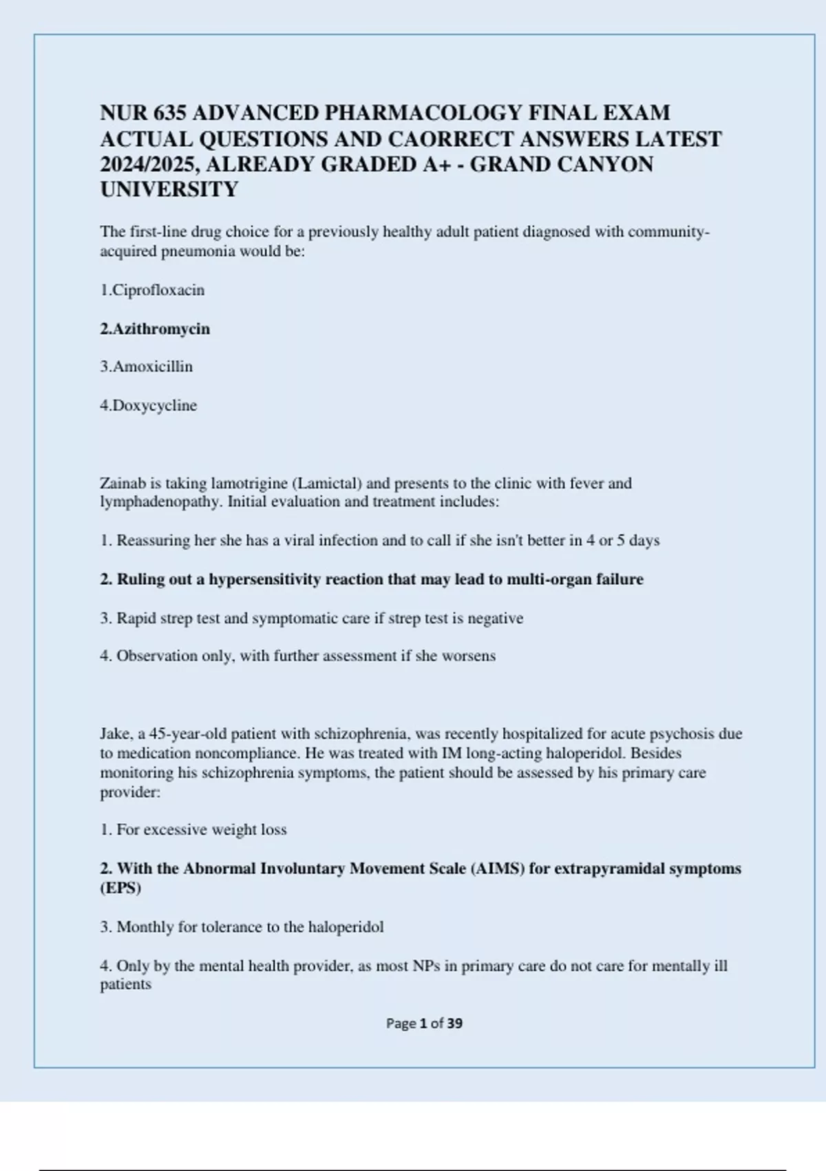 NUR 635 ADVANCED PHARMACOLOGY FINAL EXAM ACTUAL QUESTIONS AND CAORRECT ANSWERS LATEST 2024/2025, ALREADY GRADED A+ - GRAND CANYON UNIVERSITY