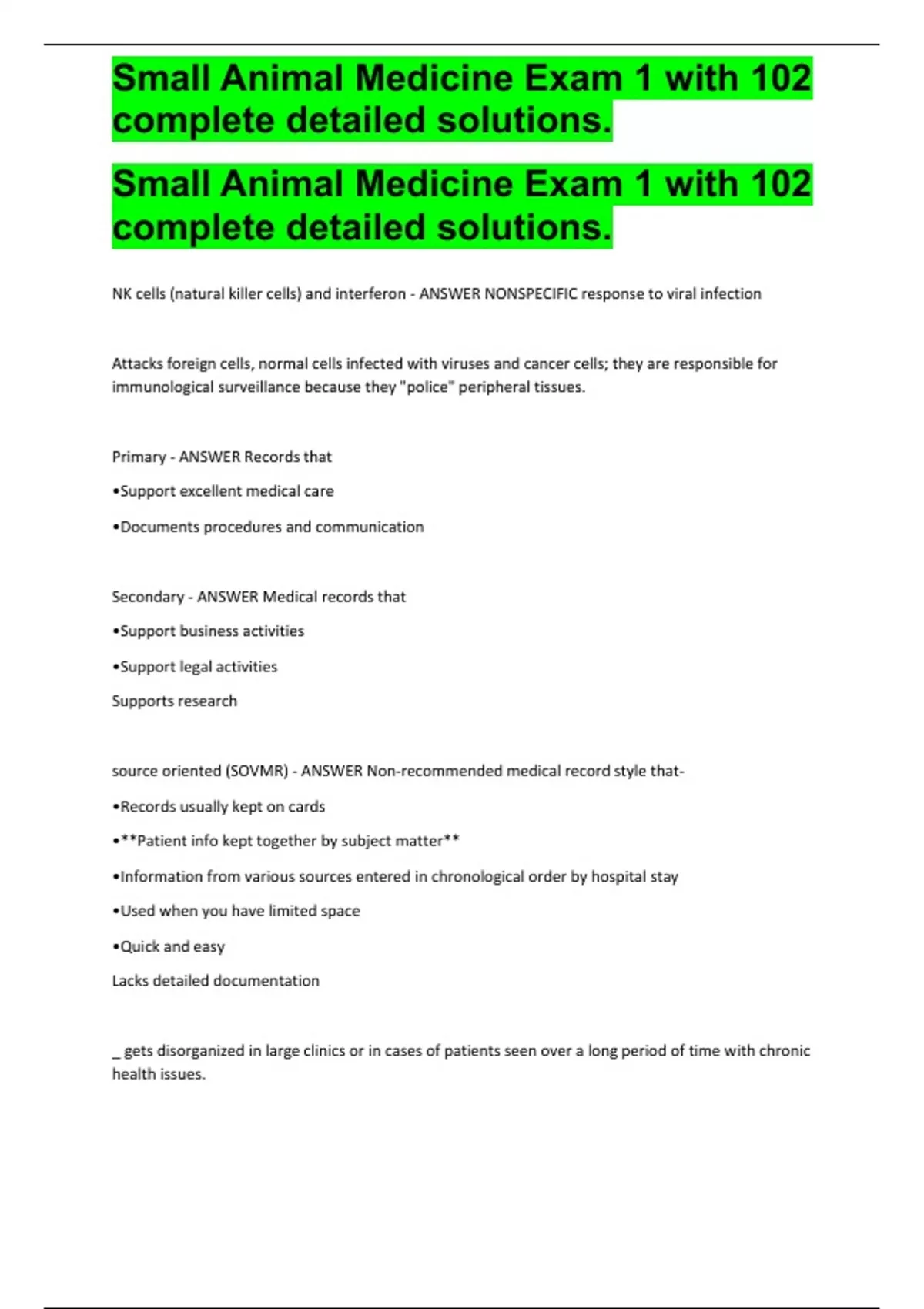Small Animal Medicine Exam 1 with 102 complete detailed solutions.