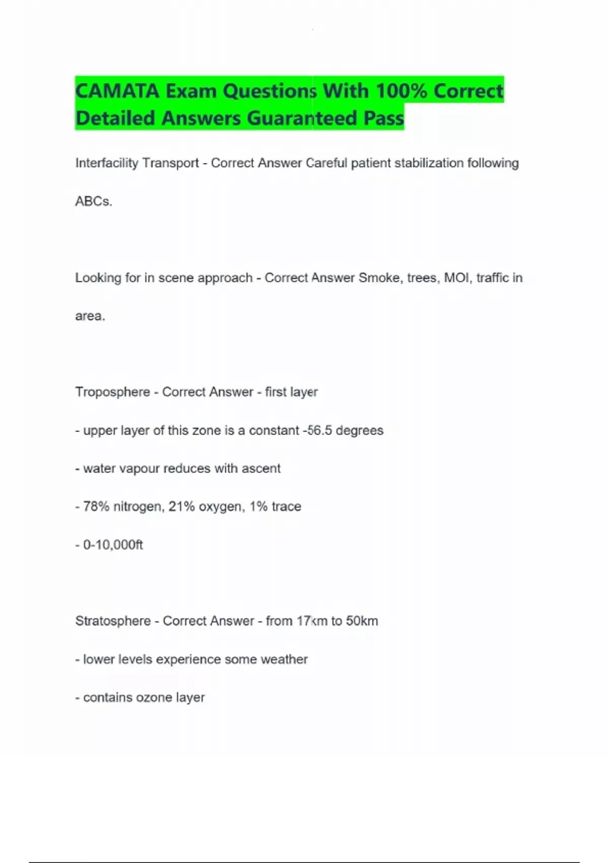 CAMATA Exam Questions With 100% Correct Detailed Answers Guaranteed Pass Interfacility Transport - Correct Answer Careful patient stabilization following ABCs. Looking for in scene approach - Correct Answer Smoke, trees, MOI, traffic in area. Troposphere - Correct Answer - first layer - upper layer of this zone is a constant -56.5 degrees - water vapour reduces with ascent - 78% nitrogen, 21% oxygen, 1% trace - 0-10,000ft Stratosphere - Correct Answer - from 17km to 50km - lower levels experience some weather - contains ozone layer - absorbs ultraviolet radiation of the sun - temperature is constant -56 - almost no water vapour present - about 24% of the total atmospheric molecular mass Mesophere - Correct Answer - from 50-80km - temperature reaches its coldest at -90