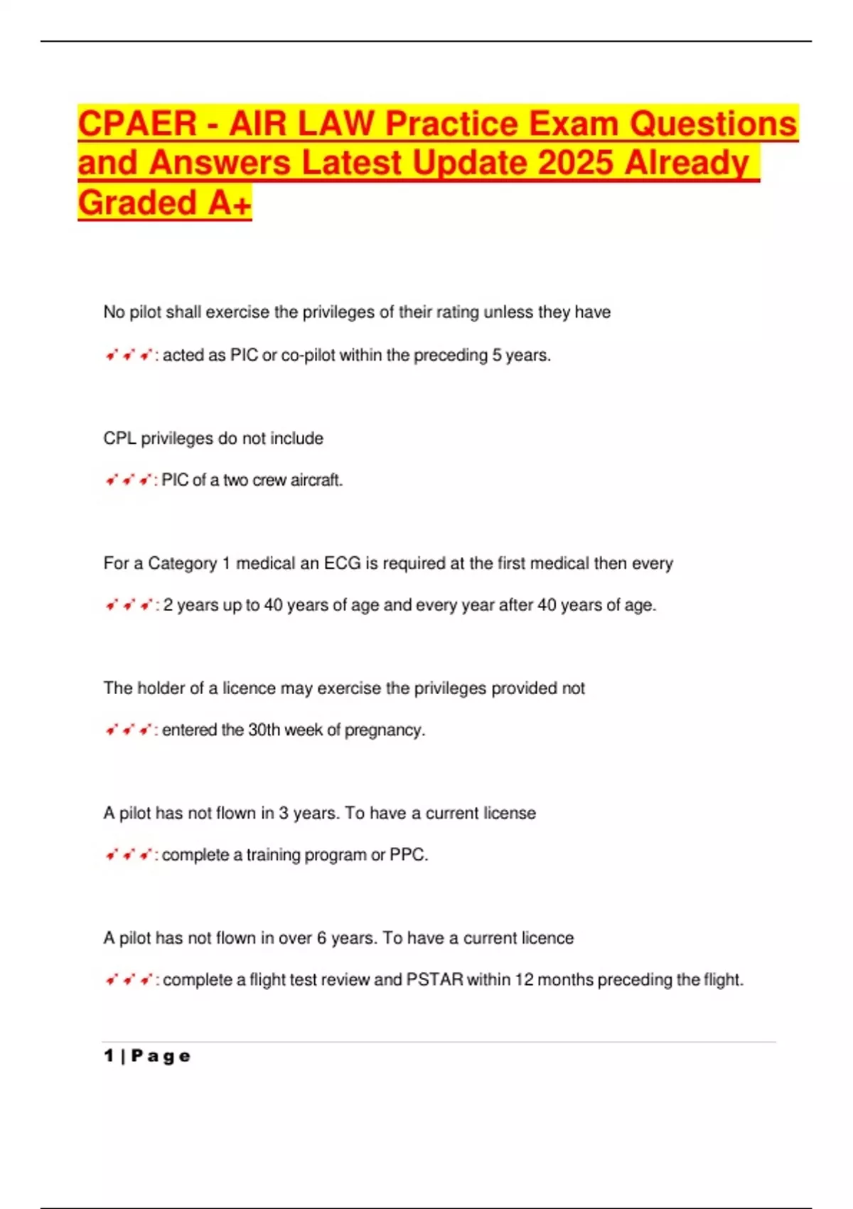 CPAER - AIR LAW Practice Exam Questions and Answers Latest Update 2025 Already Graded A+.
