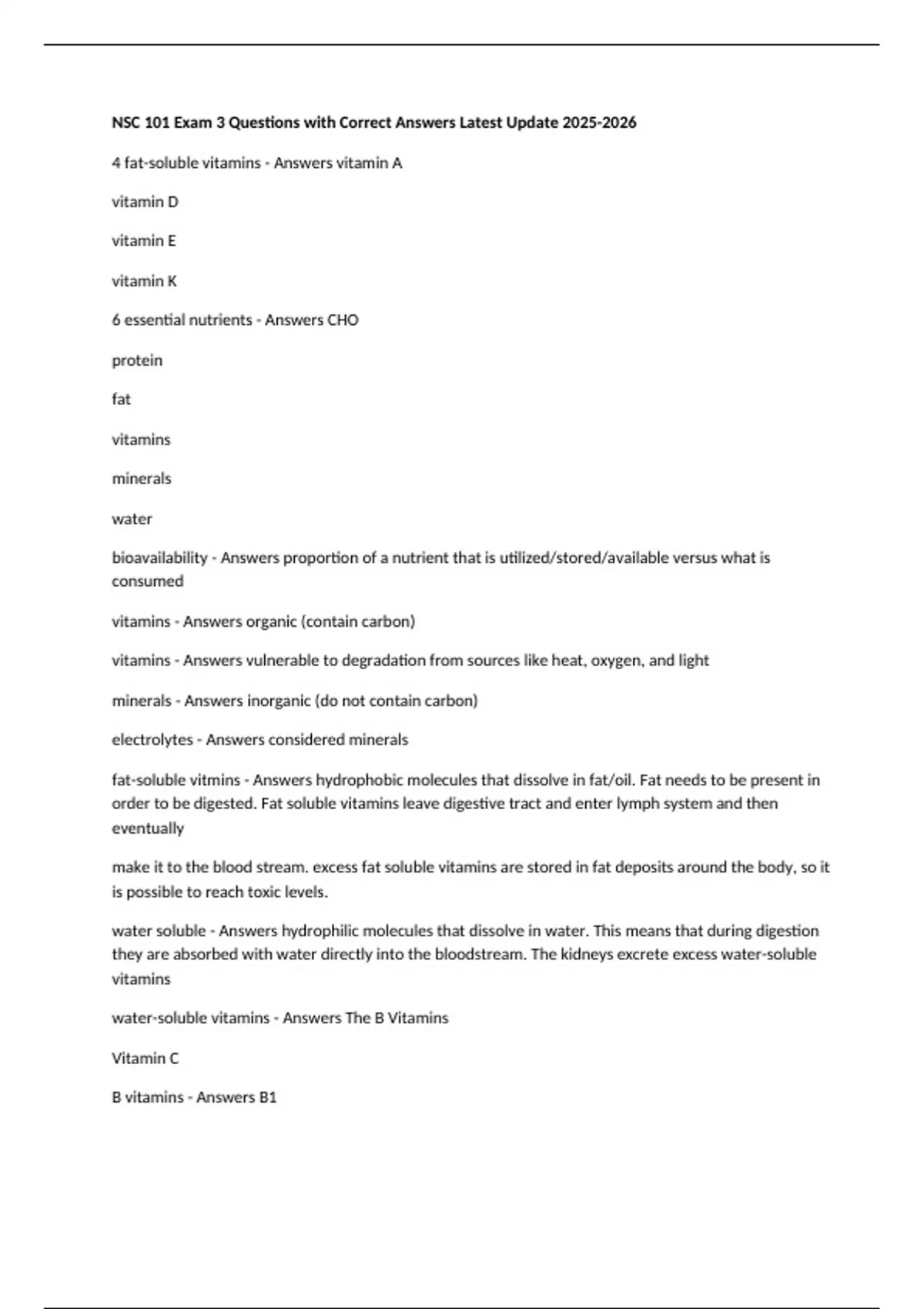 NSC 101 Exam 3 Questions with Correct Answers Latest Update 4 fat-soluble vitamins - Answers vitamin A vitamin D vitamin E vitamin K 6 essential nutrients - Answers CHO protein fat vitamins minerals water bioavailability - Answers proportion of a nutrient that is utilized/stored/available versus what is consumed vitamins - Answers organic (contain carbon) vitamins - Answers vulnerable to degradation from sources like heat, oxygen, and light minerals - Answers inorganic (do not contain carbon) electrolytes - Answers considered minerals fat-soluble vitmins - Answers hydrophobic molecules that dissolve in fat/oil. Fat needs to be present in order to be digested. Fat soluble vitamins leave digestive tract and enter lymph system and then eventually make it to the blood stream. excess fat soluble vitamins are stored in fat deposits around the body, so it is possible to reach toxic levels. water soluble - Answers hydrophilic molecules that dissolve in water. This means that during digestion they are absorbed with water directly into the bloodstream. The kidneys excrete excess water-soluble vitamins water-soluble vitamins - Answers The B Vitamins Vitamin C B vitamins - Answers B1 B2 B3 B5 B6 B7 B9 B12 B1 - Answers Thiamin B2 - Answers Riboflavin B3 - Answers Niacin B5 - Answers Pantothenic acid B6 - Answers Pyroxidine B7 - Answers Biotin B9 - Answers Folate B12 - Answers Cobalamin coenzyme - Answers nonproteins compound that is necessary for the functioning of an enzyme; several vitamins serve as coenzymes 7 major minerals - Answers Calcium Phosphorus Potassium Sodium Chloride Magnesium Sulfur 9 minor minerals - Answers Iron Zinc Manganese Copper Iodine Fluoride Chromium Molybdenum