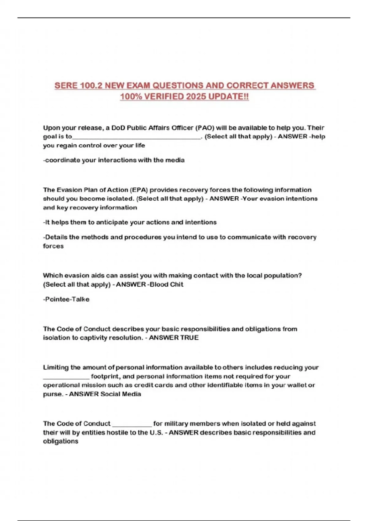 SERE 100.2 NEW EXAM QUESTIONS AND CORRECT ANSWERS 100% VERIFIED 2025 UPDATE!!...
