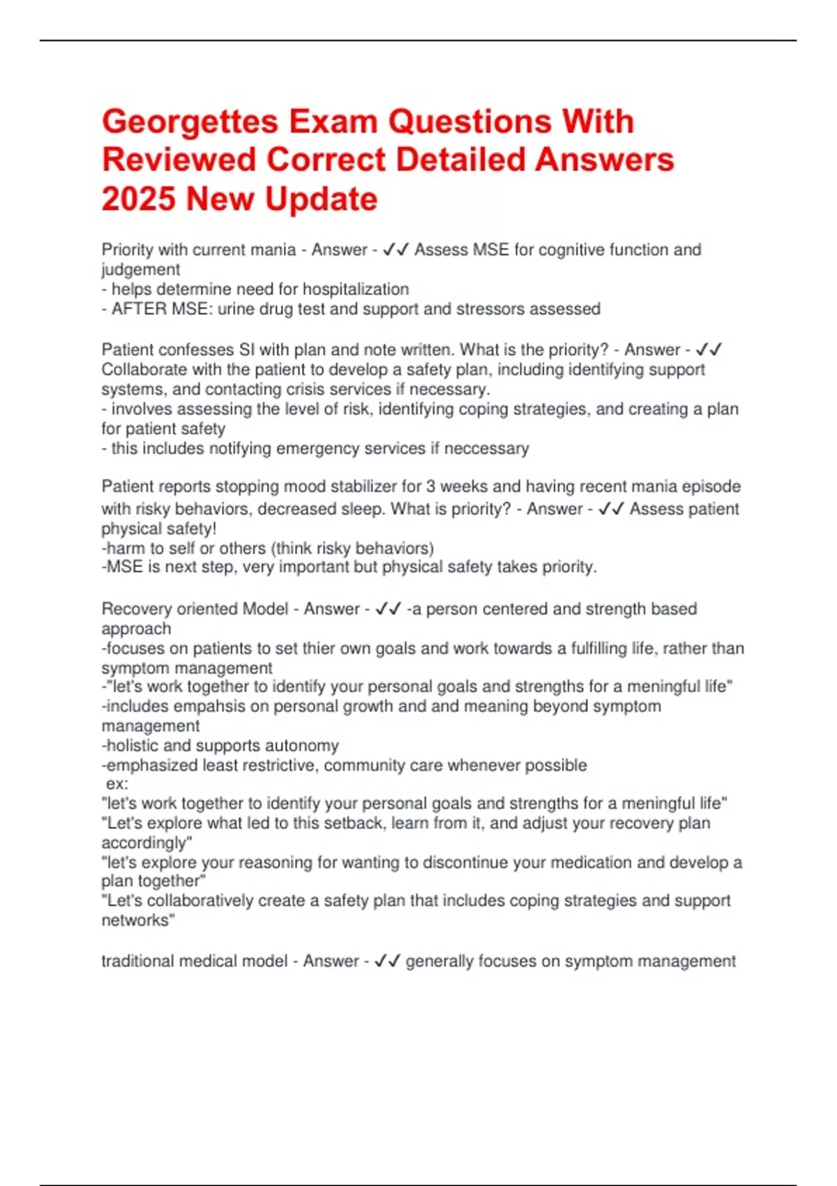 Georgettes Exam Questions With Reviewed Correct Detailed Answers 2025 New Update Priority with current mania - Answer - Assess MSE for cognitive function and judgement - helps determine need for hospitalization - AFTER MSE: urine drug test and support and stressors assessed Patient confesses SI with plan and note written. What is the priority? - Answer - Collaborate with the patient to develop a safety plan, including identifying support systems, and contacting crisis services if necessary. - involves assessing the level of risk, identifying coping strategies, and creating a plan for patient safety - this includes notifying emergency services if neccessary Patient reports stopping mood stabilizer for 3 weeks and having recent mania episode with risky behaviors, decreased sleep. What is priority? - Answer - Assess patient physical safety! -harm to self or others (think risky behaviors) -MSE is next step, very important but physical safety takes priority. Recovery oriented Model - Answer - -a person centered and strength based approach -focuses on patients to set thier own goals and work towards a fulfilling life, rather than symptom management -"let's work together to identify your personal goals and strengths for a meningful life" -includes empahsis on personal growth and and meaning beyond symptom management -holistic and supports autonomy -emphasized least restrictive, community care whenever possible ex: "let's work together to identify your personal goals and strengths for a meningful life" "Let's explore what led to this setback, learn from it, and adjust your recovery plan accordingly" "let's explore your reasoning for wanting to discontinue your medication and develop a plan together" "Let's collaboratively create a safety plan that includes coping strategies and support networks" traditional medical model - Answer - generally focuses on symptom management the patient expresses a desire to establish a personal relationship outside of therapy. What does PMHNP say? - Answer - decline the patient's invitation, explaining the importance of maintaining professional boundaries in the therapeutic relationship. -ensures the relationship maintains focused on patient recovery and well being without conflicts or ethical concerns Patient is stressed at work and requests increase in mood stabilizer. what should pmhnp do? - Answer - -discuss the patient's stressors and explore alternative coping strategies before considering a medication adjustment -medication adjustments should not be made solely in response to increased stressors; only after comprehensive assessment of mental health not just increased stress Patient is worked up and crying about traumatic event. Actively experiencing intense emotions. How do you respond? - Answer - "I am so sorry that this happened to you, it must be really difficult." -expresses empathy, validation and support -acknowledges emotions and conveys understanding: patient will feel heard and validated -DO NOT use this time to gather more information about event. DO NOT discuss guilt/blame. Start by acknowleding their current distress Patient appears anxious and hesitant to share. What is best response to get him to open up? - Answer - "tell me more about what's been bothering you." -openended -encourages narrative response ex. "Tell me more about what you mean by 'not knowing how to deal with your anxiety'" Primary purpose of using CIWA - Answer - -to assess the severity of alcohol withdrawal What medication is appropriate to treat alcohol withdrawal in a patient with liver disease? - Answer - -Lorazepam (Ativan) -shorter half life and undergoes less hepatic metabolism Benzos metabolized by the liver - Answer - -Diazepam (Valium) -chlordiazepoxide (librium) -both can be used in alcohol withdrawal with liver disease however require monitoring. Gabapentin - Answer - adjunct for alcohol withdrawal -renal excreation and does not undergo hepatic metabolism Best medication for treating extreme alcohol withdrawal symptoms including hallucinations and seizures - Answer - Lorazepam (Ativan) -Rapid onset of action to treat symptoms