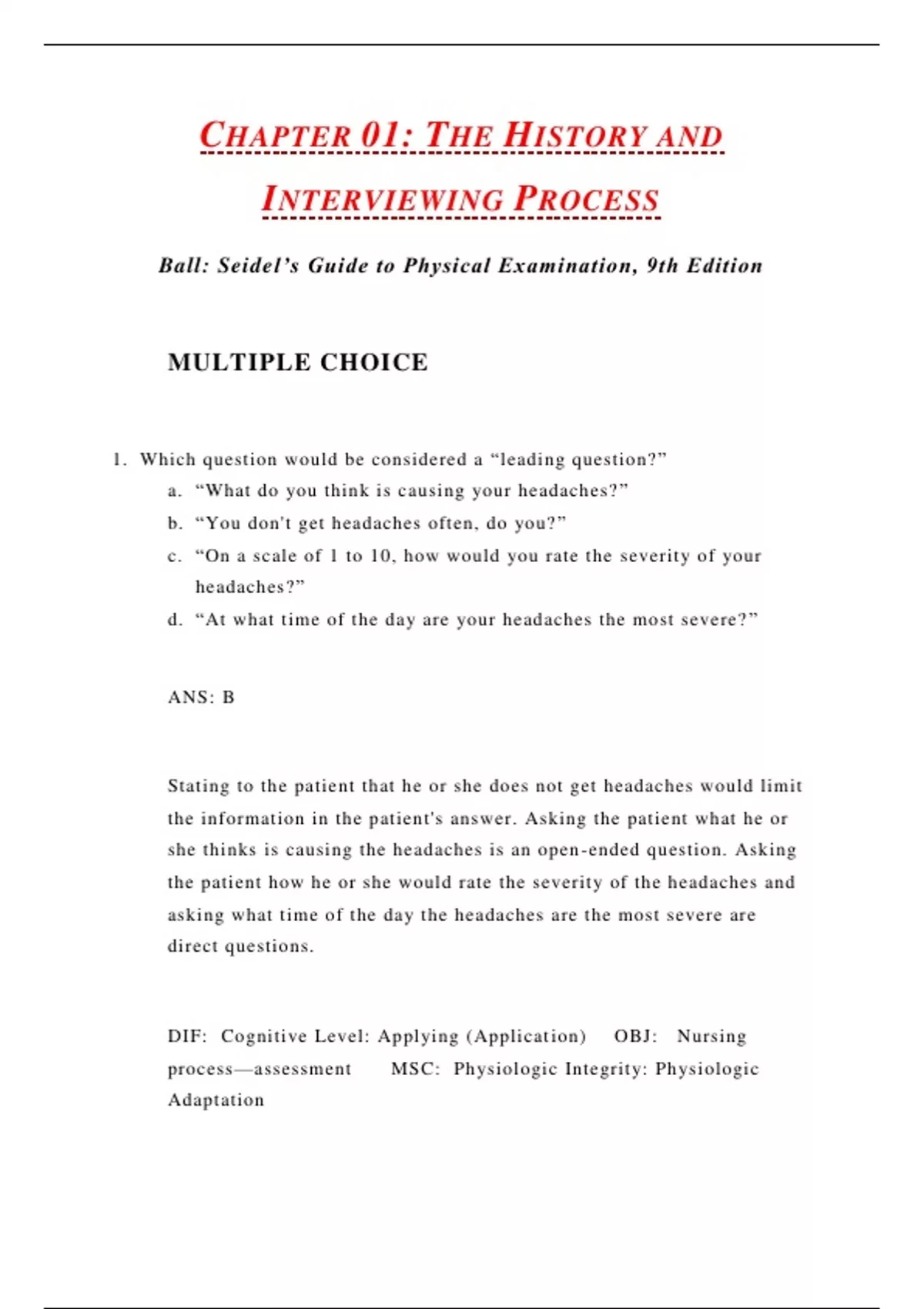 Ball: Seidel’s Guide to Physical Examination, 9th Edition MULTIPLE CHOICE 1. Which question would be considered a “leading question?” a. “What do you think is causing your headaches?” b. “You don't get headaches often, do you?” c. “On a scale of 1 to 10, how would you rate the severity of your headaches?” d. “At what time of the day are your headaches the most severe?” ANS: B Stating to the patient that he or she does not get headaches would limit the information in the patient's answer. Asking the patient what he or she thinks is causing the headaches is an open-ended question. Asking the patient how he or she would rate the severity of the headaches and asking what time of the day the headaches are the most severe are direct questions. DIF: Cognitive Level: Applying (Application) OBJ: Nursing process—assessment MSC: Physiologic Integrity: Physiologic Adaptation 2. When are open-ended questions generally most useful? a. During sensitive area part of the interview b. After several closed-ended questions have been asked c. While designing the genogram d. During the review of systems ANS: A Asking open-ended questions during the sensitive part of the interview allows you to gather more information and establishes you as an empathic listener, which is the first step of effective communication. Asking closed-ended questions may stifle the patient's desire to discuss the history of the illness. Interviewing for the purpose of designing a genogram or conducting a review of systems requires more focused data than can be more easily gathered with direct questioning. DIF: Cognitive Level: Understanding (Comprehension) OBJ: Nursing process—assessment MSC: Physiologic Integrity: Physiologic Adaptation 3. Periods of silence during the interview can serve important purposes, such as: a. allowing the clinician to catch up on documentation. b. promoting calm. c. providing time for reflection. d. increasing the length of the visit.