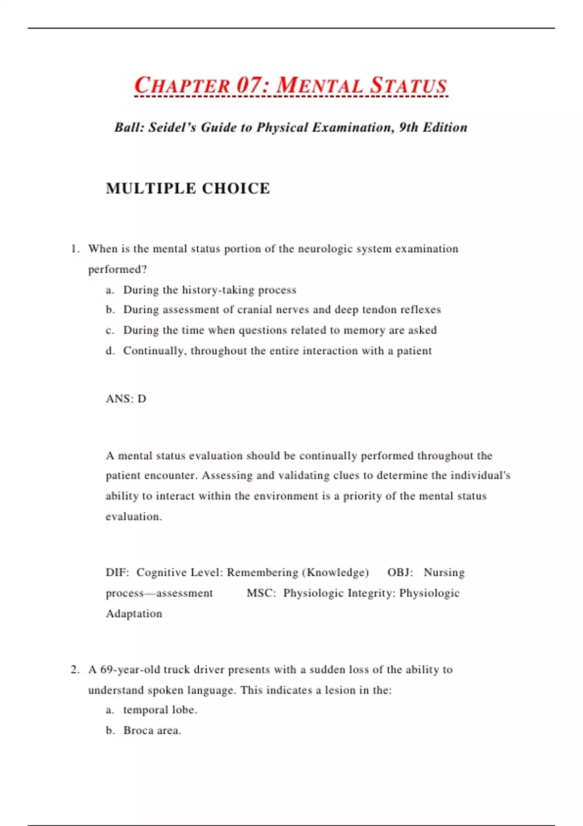 1. When is the mental status portion of the neurologic system examination