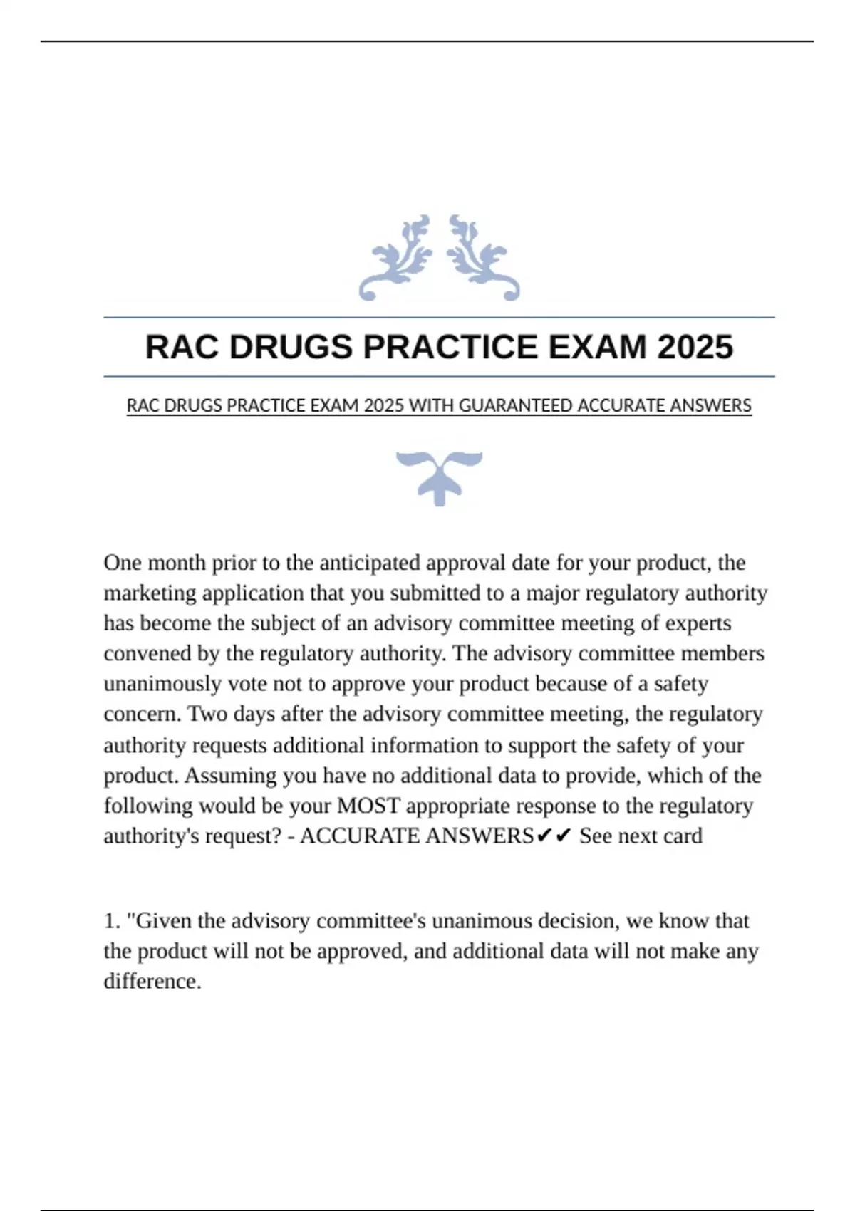 RAC DRUGS PRACTICE EXAM 2025 WITH GUARANTEED ACCURATE ANSWERS