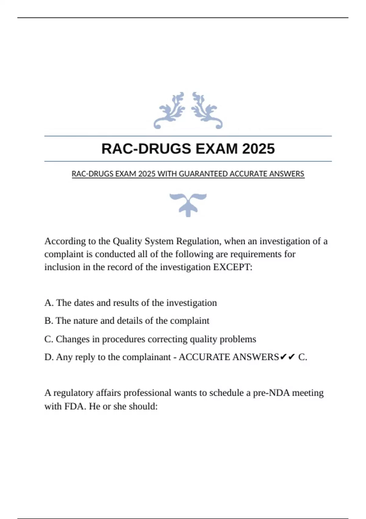 According to the Quality System Regulation, when an investigation of a complaint is conducted all of the following are requirements for inclusion in the record of the investigation EXCEPT: A. The dates and results of the investigation B. The nature and details of the complaint C. Changes in procedures correcting quality problems D. Any reply to the complainant - ACCURATE ANSWERS C. A regulatory affairs professional wants to schedule a pre-NDA meeting with FDA. He or she should: A. Write a letter to FDA requesting a Type A meeting as an amendment to the IND B. Request a Type B meeting as an amendment to the IND C. Call the project manager and set up a date over the phone for a Type C meeting D. Email the division director with a list of three dates, 30 days into the future - ACCURATE ANSWERS B. Following the "elixir of Sulfa