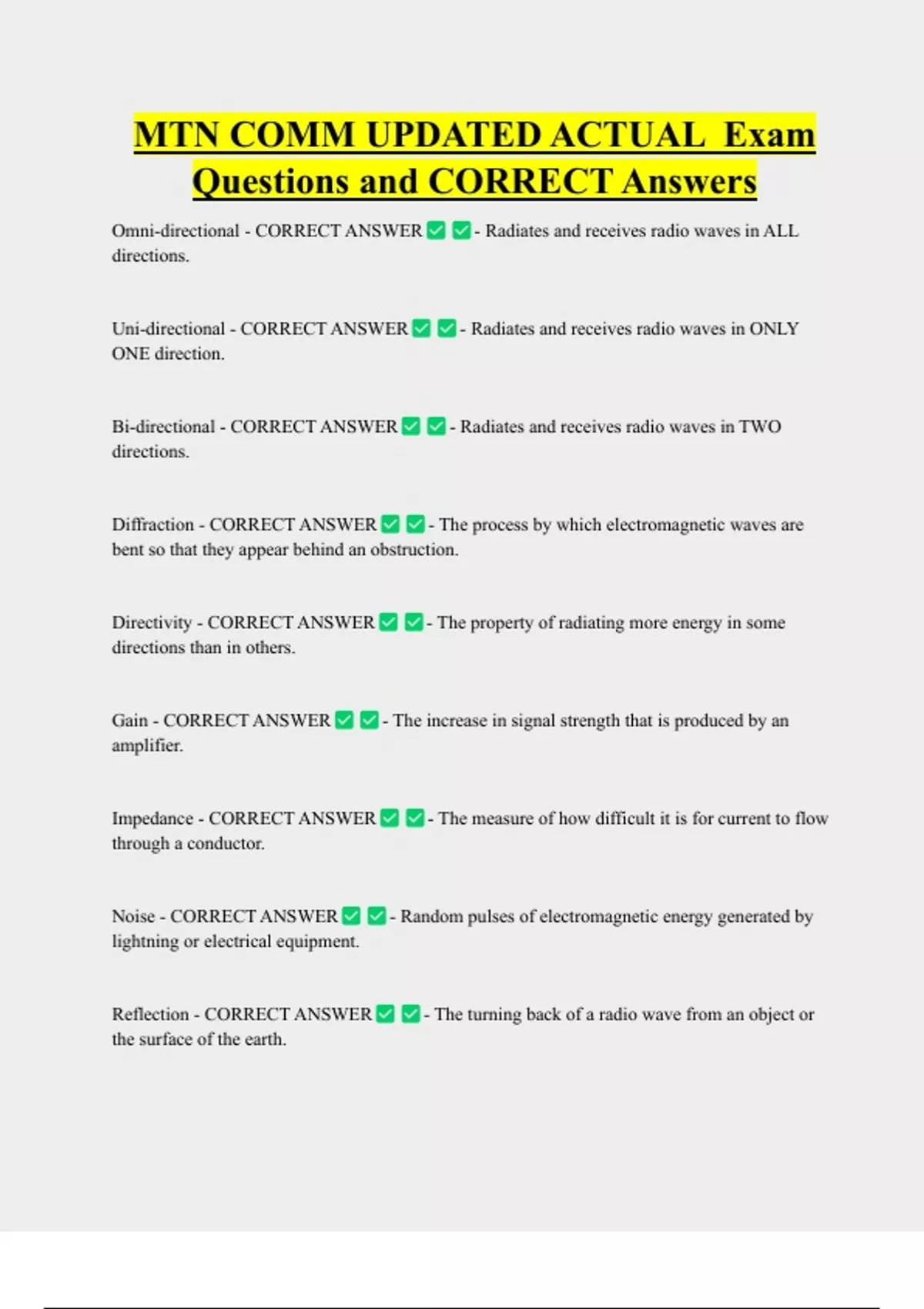 MTN COMM UPDATED ACTUAL Exam Questions and CORRECT Answers Omni-directional - CORRECT ANSWER directions. Uni-directional - CORRECT ANSWER ONE direction. Bi-directional - CORRECT ANSWER directions. Diffraction - CORRECT ANSWER - Radiates and receives radio waves in ALL - Radiates and receives radio waves in ONLY - Radiates and receives radio waves in TWO - The process by which electromagnetic waves are bent so that they appear behind an obstruction