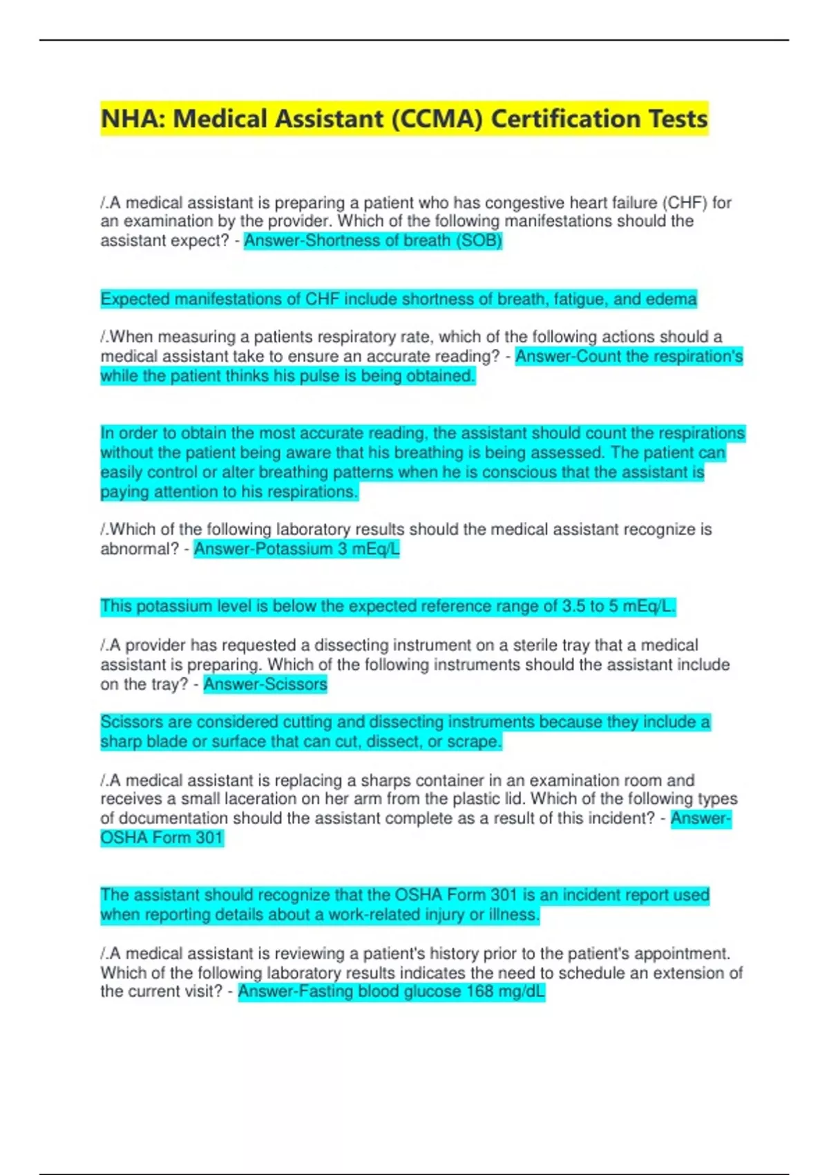 NHA: Medical Assistant (CCMA) Certification Tests /.A medical assistant is preparing a patient who has congestive heart failure (CHF) for an examination by the provider. Which of the following manifestations should the assistant expect? - Answer-Shortness of breath (SOB) Expected manifestations of CHF include shortness of breath, fatigue, and edema /.When measuring a patients respiratory rate, which of the following actions should a medical assistant take to ensure an accurate reading? - Answer-Count the respiration's while the patient thinks his pulse is being obtained. In order to obtain the most accurate reading, the assistant should count the respirations without the patient being aware that his breathing is being assessed. The patient can easily control or alter breathing patterns when he is conscious that the assistant is paying attention to his respirations. /.Which of the following laboratory results should the medical assistant recognize is abnormal? - Answer-Potassium 3 mEq/L This potassium level is below the expected reference range of 3.5 to 5 mEq/L. /.A provider has requested a dissecting instrument on a sterile tray that a medical assistant is preparing. Which of the following instruments should the assistant include on the tray? - Answer-Scissors Scissors are considered cutting and dissecting instruments because they include a sharp blade or surface that can cut, dissect, or scrape. /.A medical assistant is replacing a sharps container in an examination room and receives a small laceration on her arm from the plastic lid. Which of the following types of documentation should the assistant complete as a result of this incident? - Answer-OSHA Form 301 The assistant should recognize that the OSHA Form 301 is an incident report used when reporting details about a work-related injury or illness. /.A medical assistant is reviewing a patient's history prior to the patient's appointment. Which of the following laboratory results indicates the need to schedule an extension of the current visit? - Answer-Fasting blood glucose 168 mg/dL This fasting blood glucose level is above the expected reference range of 70 to 130 mg/dL. The assistant should notify the provider and schedule an extension of the patient's visit. /.A medical assistant is reinforcing instructions with a patient about how to take a buccal of the following instructions should the assistant give the patient? - Answer-"Place the tablet between you or gums and cheek." The assistant should instruct the patient to place the buccal tablet between his gums and his cheek. A buccal tablet acts faster than oral tablets because it does not need to pass through the gastrointestinal tract to be absorbed. /.Which of the following terms should a medical assistant use to tell a provider that a patient is having discomfort and difficulty breathing? - Answer-Dyspnea Dyspnea is a term used to indicate that a patient is experiencing difficult or painful breathing. /.Which of the following methods is used to notify a provider of the denial of a claim by an insurance carrier? - Answer-Remittance advice A remittance advice document itemizes all paid, denied, and allowable charges for a patient. This document notifies the provider of any and all claim denials. /.Which of the following positions is appropriate for a pelvic exam? - Answer-Lithotomy The lithotomy position is appropriate for pelvic examinations. /.Which of the following cardiac procedures is within a medical assistants scope of practice and does not require a licensed technician or provider to assist or perform it? - Answer-Holter monitor application A Holter monitor is a system for recording cardiac activity for 24 hr or longer. It is within an assistant's scope of practice to place and remove a Holter monitor. /.Which of the following EKG artifacts is caused by a disconnected electrode and results in the tracing going into the margins of the paper? - Answer-Interrupted baseline Interrupted baseline is caused by an electrical disconnection or a detached electrode and results in the tracing moving into the margins of the paper. /.A medical assistant receives a telephone call from a patient who seems anxious about the results of a test. Which of the following responses should the assistant make? - Answer-"I know you are concerned about your test results. We'll call you as soon as your results come in." This response shows empathy and active listening skills on the part of the assistant, which communicates to the patient that the assistant recognizes his emotions. Empathy allows the assistant to validate the patient's emotions without becoming unprofessional and losing objectivity. This response is an example of an appropriate way to communicate with the patient. /.A medical assistant is assisting with the physical examination of a patient who has scabies. Besides gloves, which of the following pieces of personal protective equipment should the assistant wear? - Answer-Gown Scabies requires contact precautions; therefore, the assistant should wear gloves and a gown. Other patient conditions that require contact precautions include hepatitis A, rotavirus, and herpes zoster (shingles). /.A patient loses consciousness. The EKG reveals ventricular fibrillation. Which of the following actions should a medical assistant take first? - Answer-Call for help and begin CPR According to the American Heart Association's resuscitation guidelines, the assistant should call for help and perform CPR immediately after witnessing a cardiac arrest. /.A medical assistant is composing business correspondence using the simplified letter style. Which of the following features should the assistant use? - Answer-A subject line in all capital letters. In the simplified letter style, the subject line is in all capital letters and replaces the salutation. /.Where should a medical assistant place the electrode for lead V5? - Answer-On the left anterior axillary line, horizontal to V4. This is the proper placeme