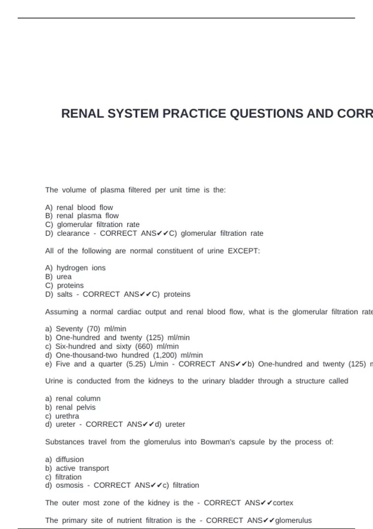 RENAL SYSTEM PRACTICE QUESTIONS AND CORR