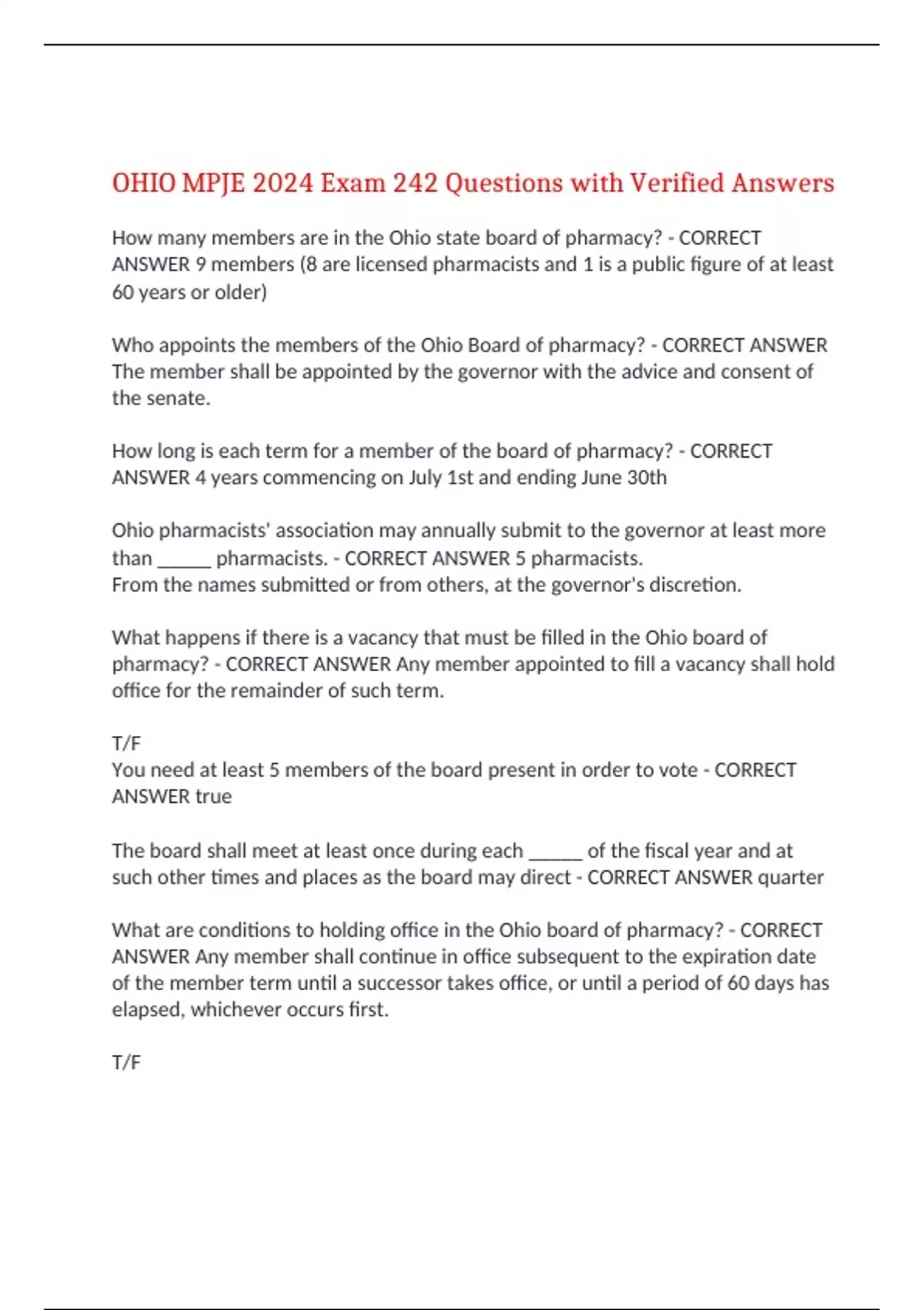 pharmacy? - CORRECT ANSWER Any member appointed to fill a vacancy shall hold