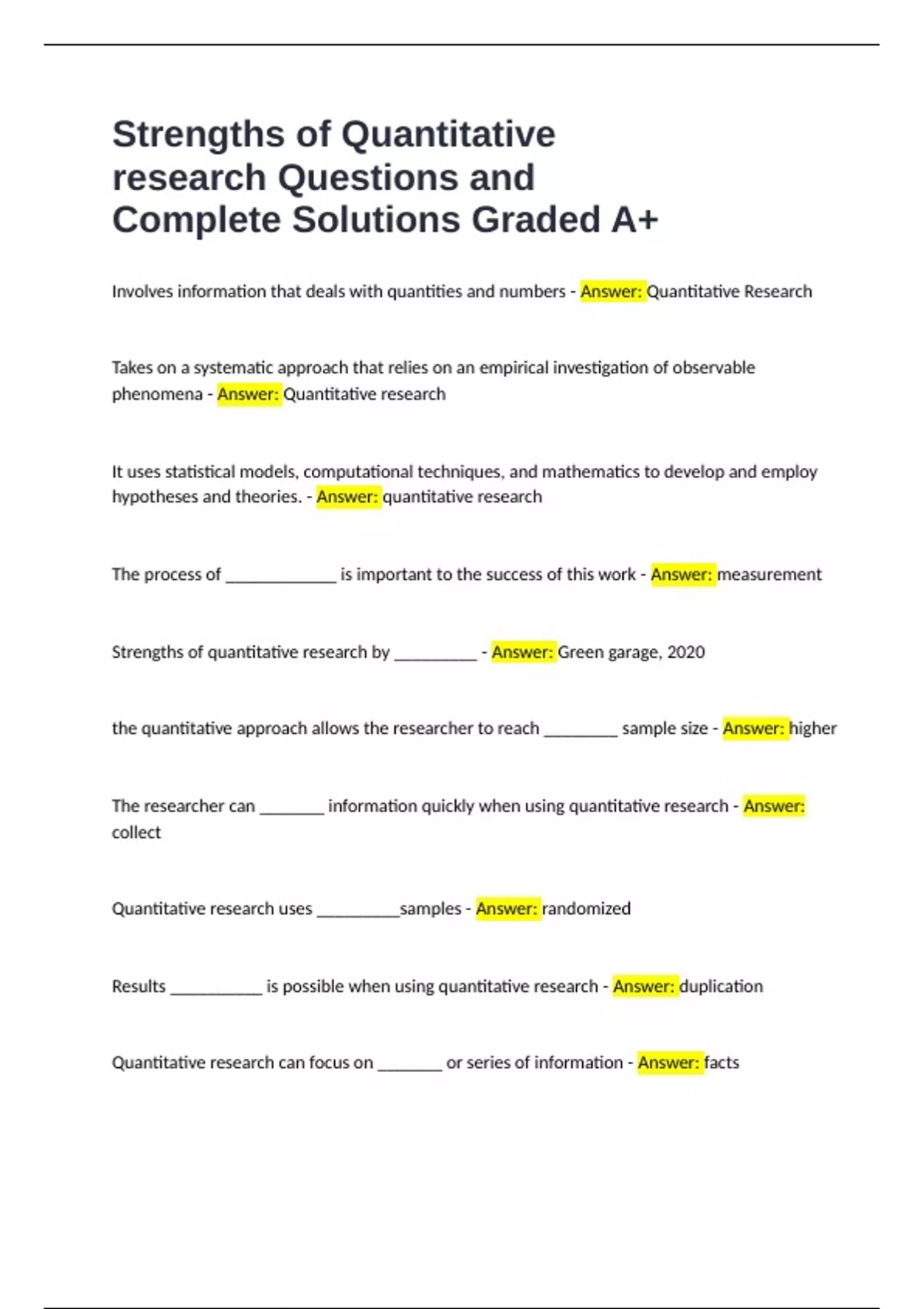 Strengths of quantitative research by _________ - Answer: Green garage, 2020