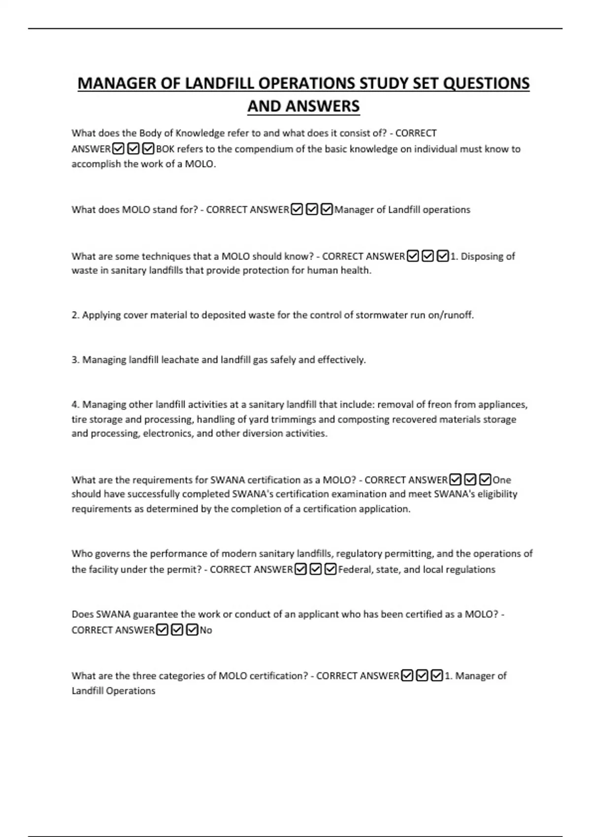 MANAGER OF LANDFILL OPERATIONS STUDY SET QUESTIONS AND ANSWERS