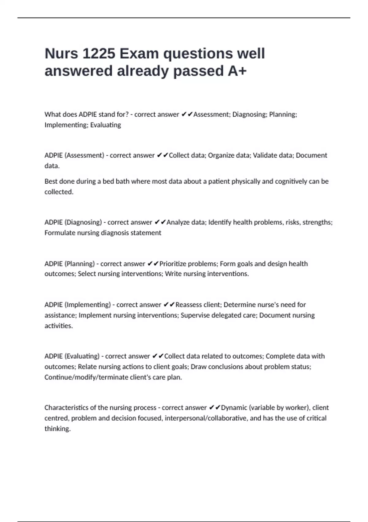 ADPIE (Diagnosing) - correct answer ✔✔Analyze data; Identify health problems, risks, strengths;