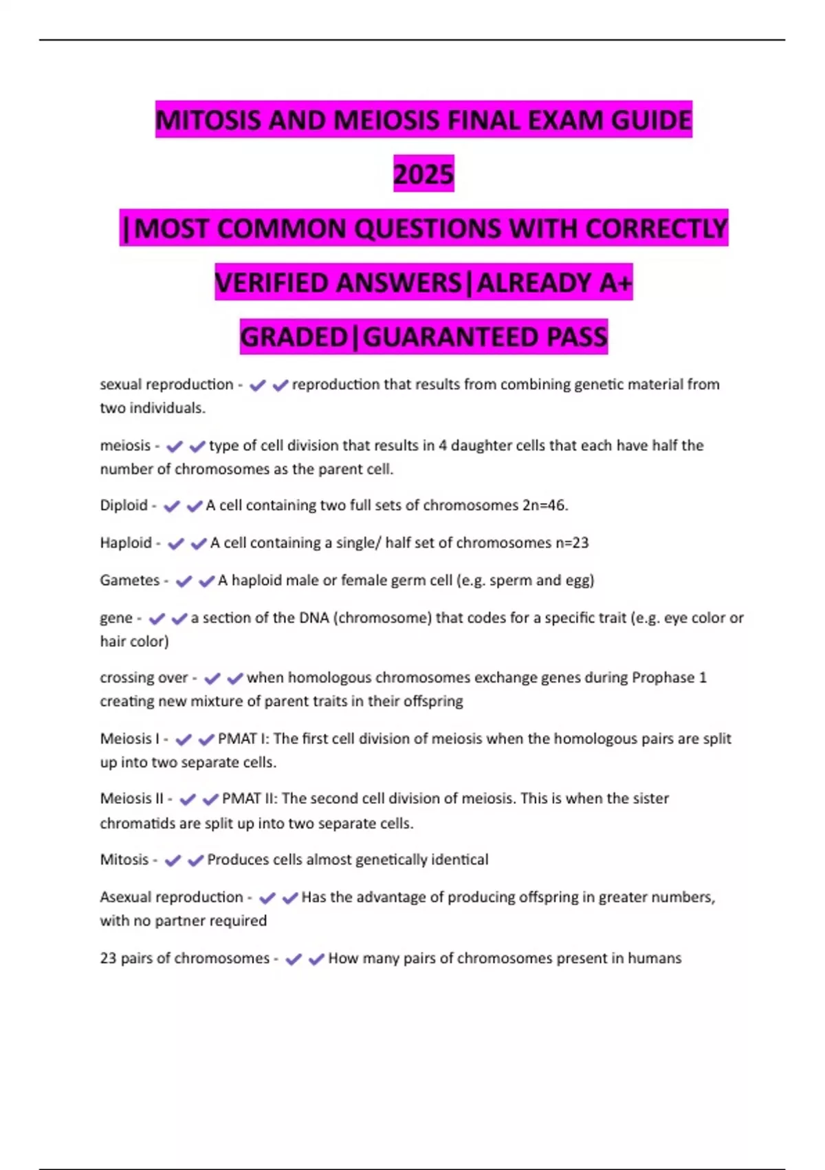MITOSIS AND MEIOSIS FINAL EXAM GUIDE 2025 |MOST COMMON QUESTIONS WITH CORRECTLY VERIFIED ANSWERS|ALREADY A+ GRADED|GUARANTEED PASS