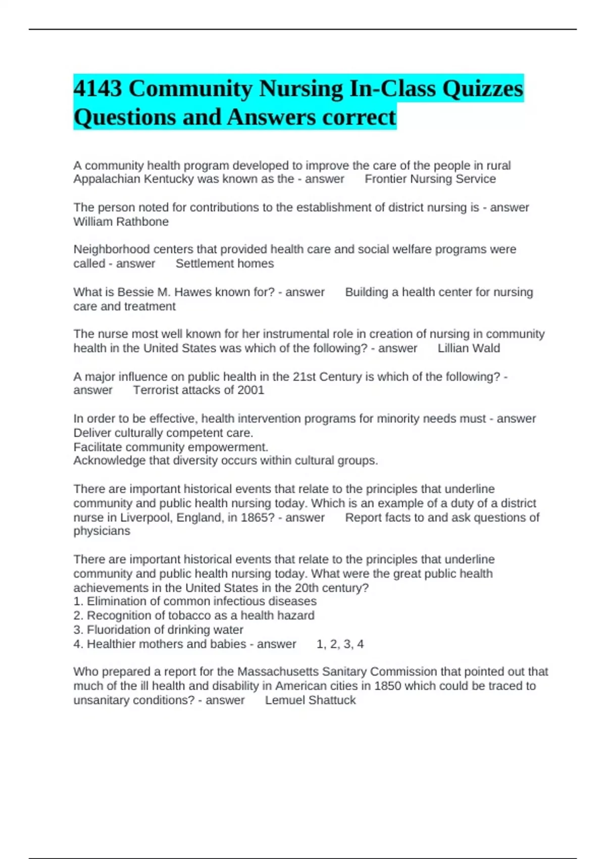 4143 Community Nursing In-Class Quizzes Questions and Answers correct A community health program developed to improve the care of the people in rural Appalachian Kentucky was known as the Frontier Nursing Service The person noted for contributions to the establishment of district nursing is William Rathbone Neighborhood centers that provided health care and social welfare programs were called Settlement homes What is Bessie M. Hawes known for? Building a health center for nursing care and treatment The nurse most well known for her instrumental role in creation of nursing in community health in the United States was which of the following? Lillian Wald A major influence on public health in the 21st Century is which of the following? Terrorist attacks of 2001 In order to be effective, health intervention programs for minority needs must Deliver culturally competent care. Facilitate community empowerment. Acknowledge that diversity occurs within cultural groups. There are important historical events that relate to the principles that underline community and public health nursing today. Which is an example of a duty of a district nurse in Liverpool, England, in 1865? Report facts to and ask questions of physicians There are important historical events that relate to the principles that underline community and public health nursing today. What were the great public health achievements in the United States in the 20th century? 1. Elimination of common infectious diseases 2. Recognition of tobacco as a health hazard 3. Fluoridation of drinking water 4. Healthier mothers and babies 1, 2, 3, 4 Who prepared a report for the Massachusetts Sanitary Commission that pointed out that much of the ill health and disability in American cities in 1850 which could be traced to unsanitary conditions? Lemuel Shattuck The main characteristics of partnership are Informed, flexible, and negotiated distribution of power The federal government plays an important role in regulation of public health. What public health entities are often regulated? 1. Food 2. Medications 3. School health 4. Devices 5. Environment 1, 2, 4, 5 Which of the following best describes community-based nursing? A philosophy that guides family-centered illness care What is the unique primary focus of public health nursing? Promotion of quality of life What is the preferred public health approach to avoid premature deaths in America? Influencing Americans' lifestyle behavior choices What action would be most typical of a public health nurse? The nurse works with community groups to create policies to improve the community's environment. A registered nurse (RN) was just employed as a public health nurse. Which question might be very relevant as the nurse begins employment? "Which groups are at the greatest risk for problems?" The core functions of public health include all of the following except Prevention Which of the following represents public health nursing? Assessing the services and effectiveness of the school health clinic. You are conducting a community assessment in a town once supported by multiple paper factories. The factories closed 2 years ago and the majority of the population is now out of work. The school nurse notes that 68% of the students are behind in their physicals and immunizations. On the basis of your community assessment, you will recommend the initiation of neighborhood clinics at low or no cost to the community. The core functions of public health include all of the following except Prevention All of the following dimensions of a community's life and environment can be observed through the windshield assessment with the exception of which of the following Access to personal health services