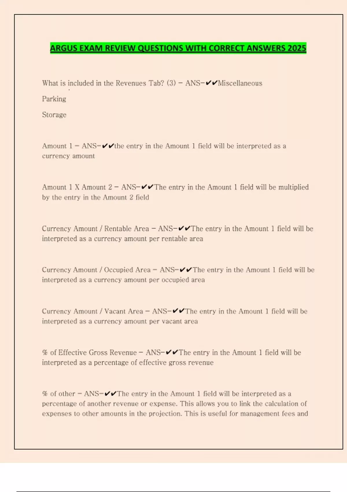ARGUS EXAM REVIEW QUESTIONS WITH CORRECT ANSWERS 2025 What is included in the Revenues Tab? (3) - ANS-Miscellaneous Parking Storage Amount 1 - ANS-the entry in the Amount 1 field will be interpreted as a currency amount Amount 1 X Amount 2 - ANS-The entry in the Amount 1 field will be multiplied by the entry in the Amount 2 field Currency Amount / Rentable Area - ANS-The entry in the Amount 1 field will be interpreted as a currency amount per rentable area Currency Amount / Occupied Area - ANS-The entry in the Amount 1 field will be interpreted as a currency amount per occupied area Currency Amount / Vacant Area - ANS-The entry in the Amount 1 field will be interpreted as a currency amount per vacant area % of Effective Gross Revenue - ANS-The entry in the Amount 1 field will be interpreted as a percentage of effective gross revenue % of other - ANS-